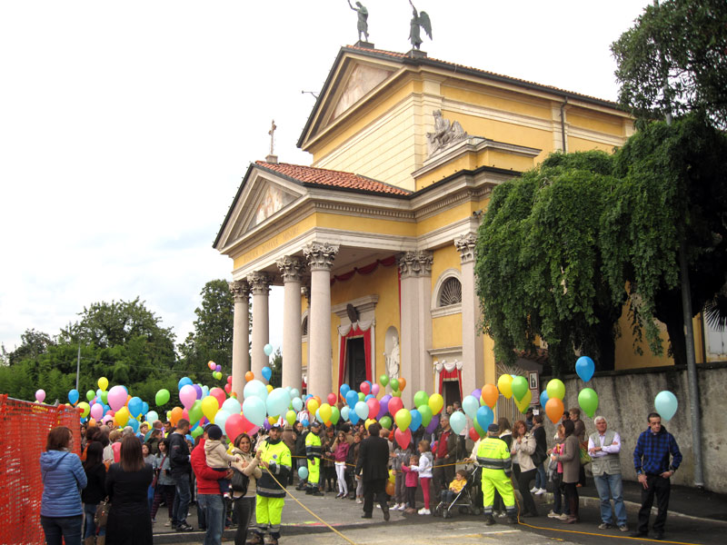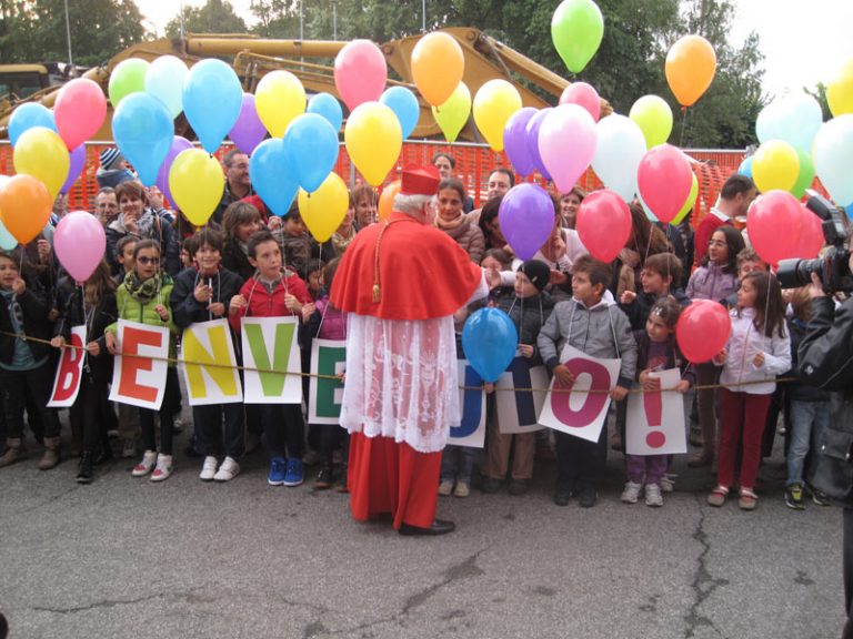 A Besana hanno fatto le cose in grande. Centinaia di persone aspettano il cardinale Angelo Scola sul sagrato della chiesa parrocchiale. Decine i bambini e ragazzi, ciascuno con in mano un palloncino colorato che contribuisce a un colpo d’occhio sorprendente. Appena l’Arcivescovo scende dall’auto risuonano nell’aria le note della banda musicale, una vera istituzione in città, con le sue sbandieratrici.