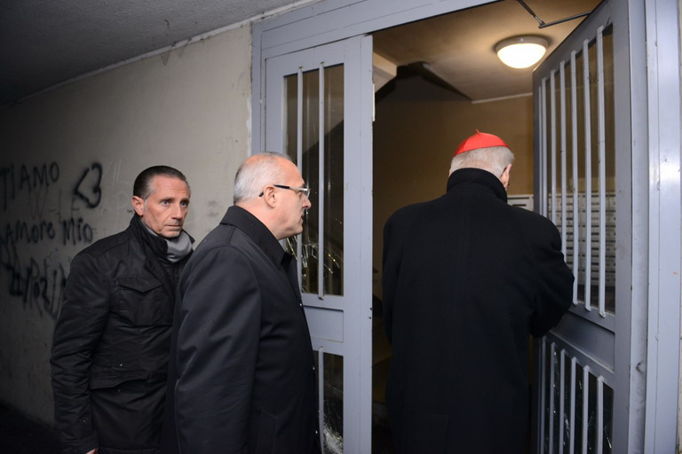 L’Arcivescovo sale al nono piano di “Salomone 21” – l’ascensore, quasi a voler dare ragione alle lamentele degli inquilini, non funziona -, incontra famiglie e anziani, gli si aprono le porte, qualcuno lo vede e lo invita a entrare nel proprio appartamento. C’è una donna di 94 anni che vive sola e un’altra di 87, allettata da 15 mesi; e, poi, le famiglie: una di “prima immigrazione”, giunta dal Sud una ventina di anni fa, con figli che frequentano le scuole medie inferiori e superiori che è attiva in parrocchia; un altro nucleo di quattro persone che vive in 28 metri quadri; uno composto di sette persone, tra cui cinque anziani.