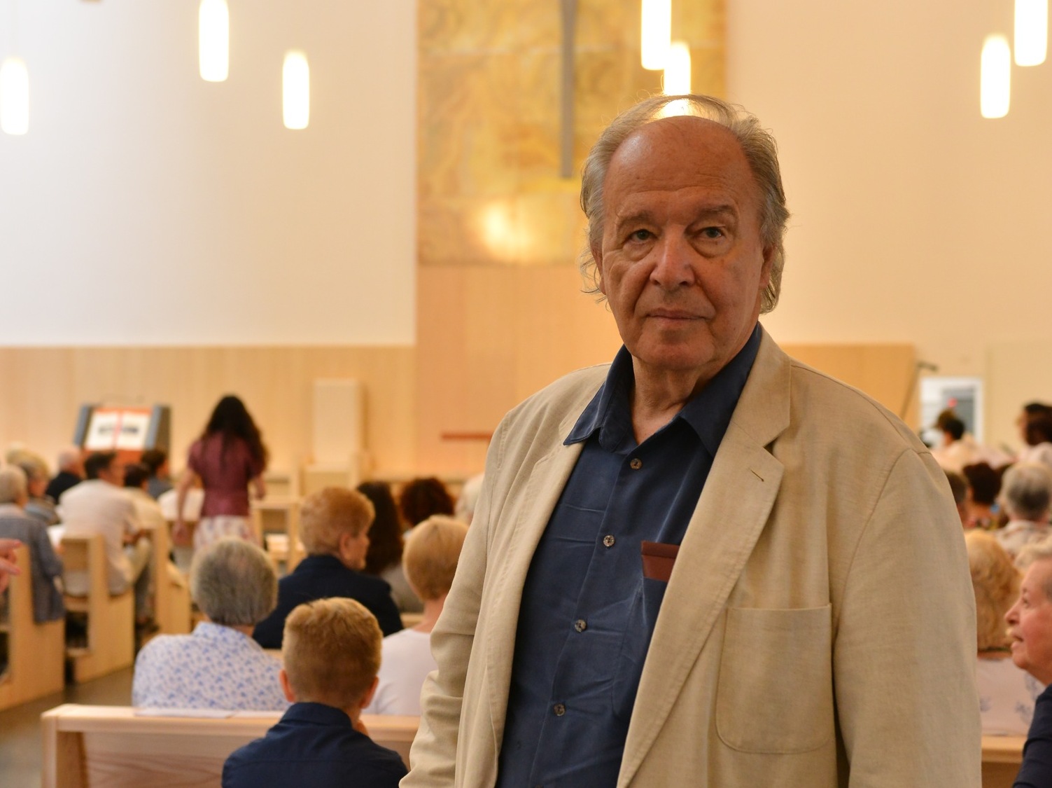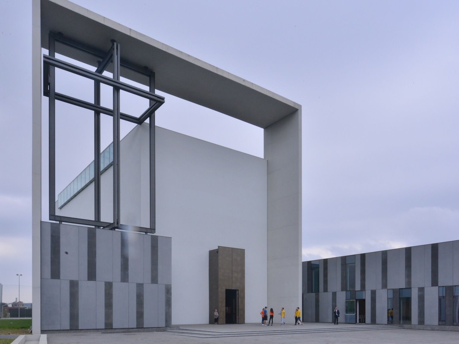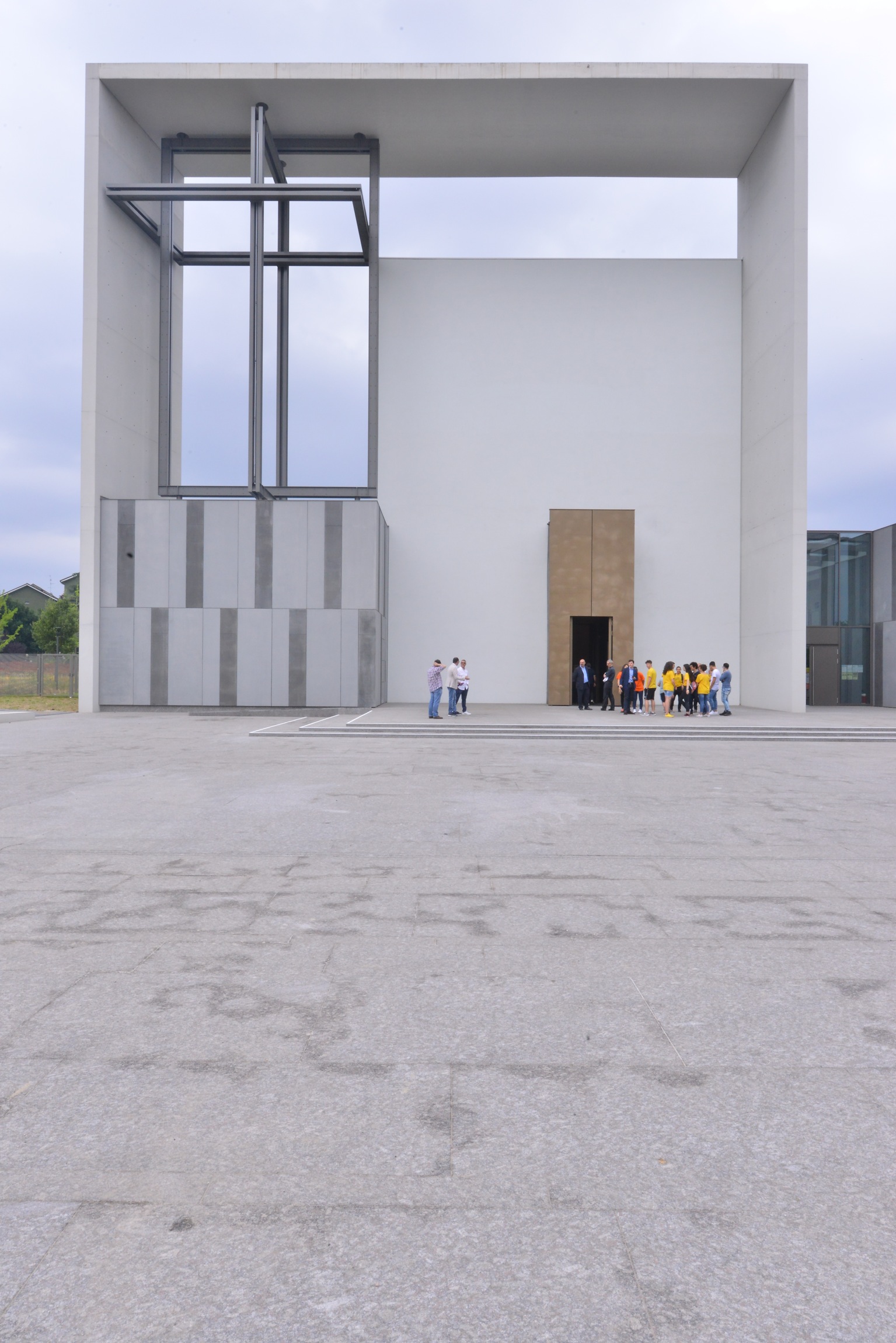 Un’aula dalle linee rigorose, ma armoniche, caratterizzata dallo scuro del granito del pavimento, dal bianco e dal colore caldo del legno di betulla che si alternano alle pareti, con un effetto bilanciato di luce che arriva fino alle vetrate in alabastro. Così come, suggestivamente, è pure alabastrata la maestosa lastra del Presbiterio su cui, da pochi giorni, è stato posto il Crocifisso dell’artista tedesco Karl Schlamminger, un’opera unica donata dalla Comunità pastorale “Madonna della Cintura” di Cusano Milanino (il parroco don Andrea Ferrarotti concelebra), che riprende la monumentale struttura a croce tridimensionale in ferro dell’esterno.