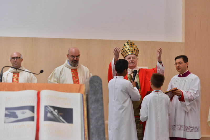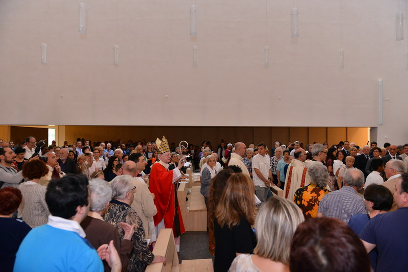 Poi, le Litanie dei Santi, la Preghiera di Dedicazione, l’unzione dell’altare e delle pareti della Chiesa, l’incensazione e la copertura dell’altare stesso; le fiammelle accese a quella portata tra le mani dall’Arcivescovo e le luci che illuminano l’aula a simboleggiare la luce di Cristo che accompagna, anche nel nuovo tempio, questa Comunità, nata nel 1984 e a lungo ospitata, per le Celebrazioni, in un ex-asilo comunale.