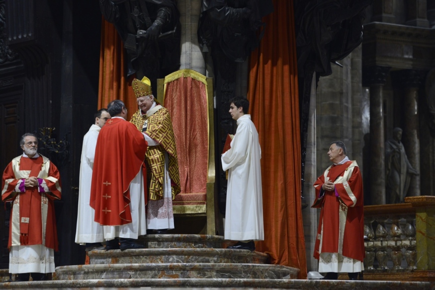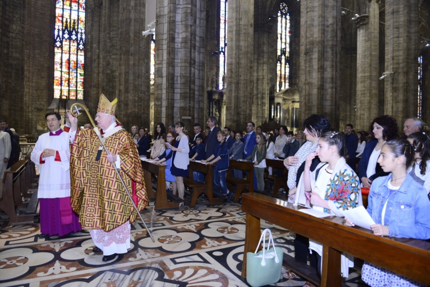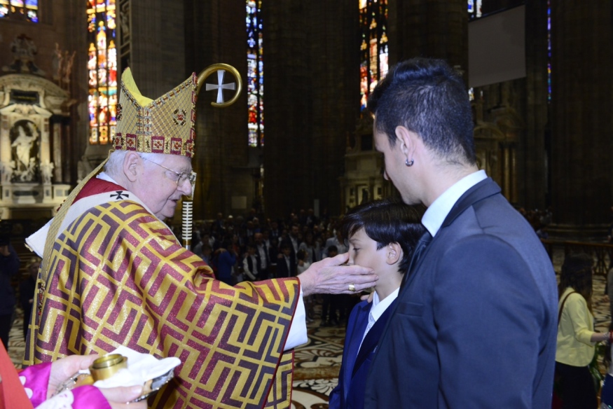 Poi, la liturgia della Confermazione, con la rinnovazione delle promesse battesimali, l’imposizione della mani, la crismazione, conferita personalmente dal Cardinale a cinquanta ragazzi – equamente divisi tra le due Comunità Pastorali –, mentre, accanto a lui, compiono lo stesso gesto cinque Canonici del Capitolo metropolitano, tra cui l’Arciprete del Duomo, monsignor Borgonovo.