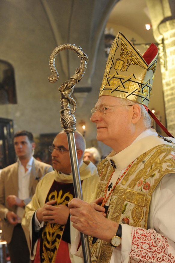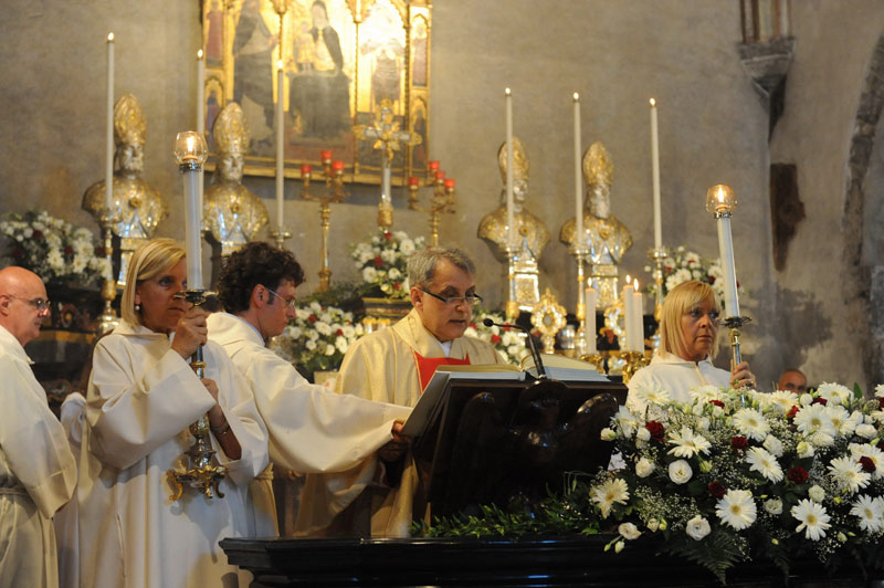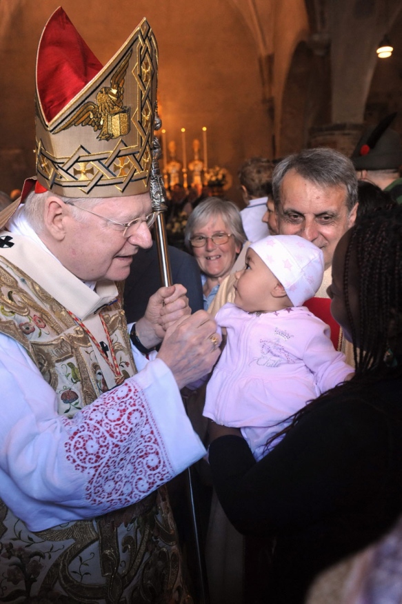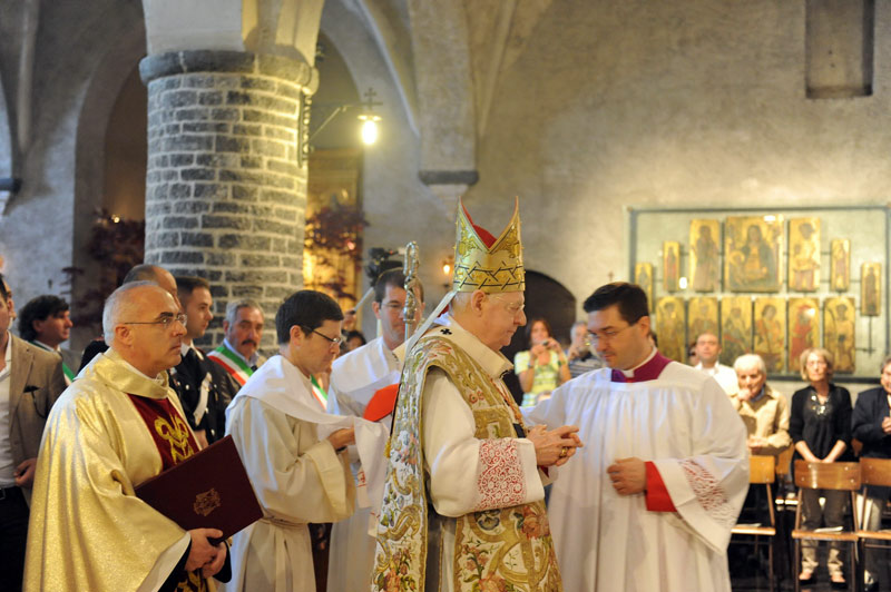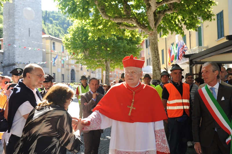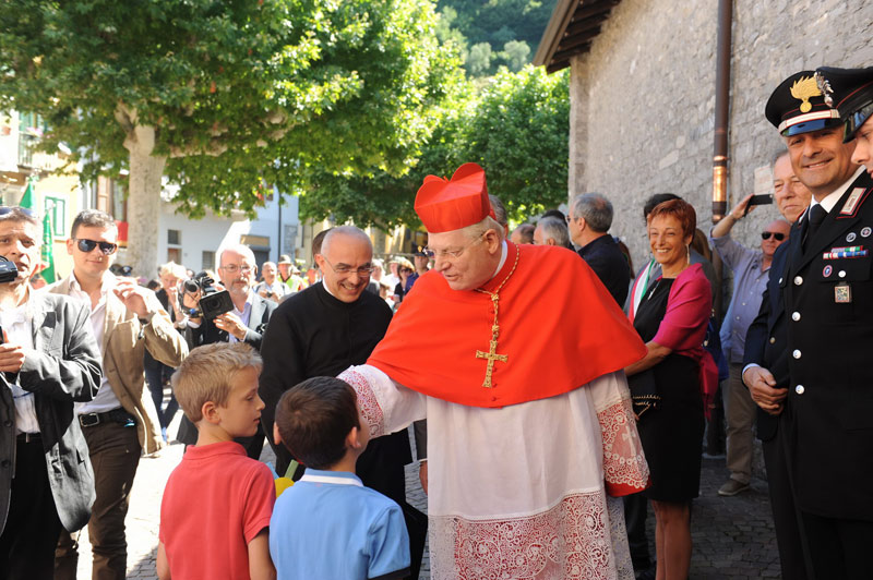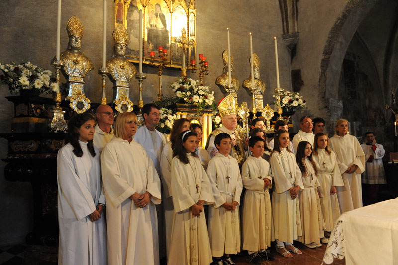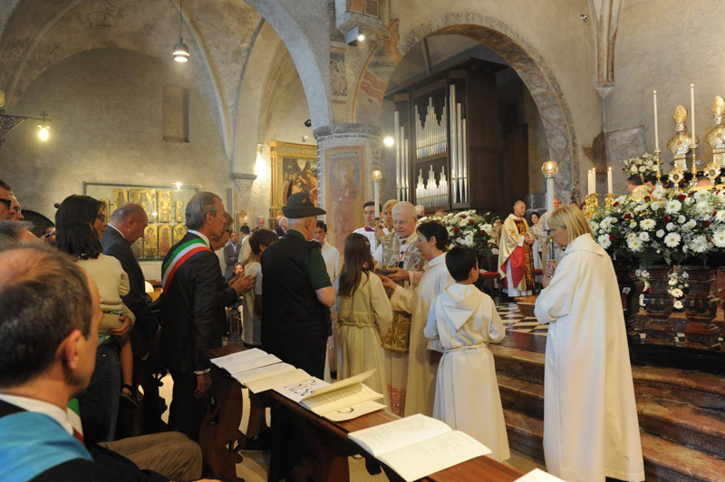 Il Cardinale Scola, come i moltissimi che gli si stringono intorno al suo arrivo a Varenna, ha negli occhi la bellezza di una giornata che anch’essa, come l’intero paese, si è vestita a festa per l’occasione. E così tra i colori finalmente estivi di questo angolo dell’alto Lario, il suono della banda, la presenza degli Alpini e delle autorità civili, tra cui il presidente della Provincia di Lecco, Negri e il primo cittadino di Varenna, Molteni, ma soprattutto l’affettuosa accoglienza della gente – con tanti bambini che l’Arcivescovo benedice e saluta con un affetto particolare –, accompagna la piccola processione che dalla millenaria chiesetta di San Giovanni Battista, arriva nella Prepositurale, altrettanto ricca di storia, di san Giorgio. Tempio consacrato nel 1313 che, quindi, “compie” i 700 anni della sua dedicazione. Lo ricorda il prevosto, don Aldo Monga, cui sono accanto il vicario di Zona III, monsignor Maurizio Rolla e altri concelebranti, in quella che definisce “un’oasi di pace di cui abbiamo tutti tanti bisogno e che vogliamo rendere ancora più bella con il restauro dei preziosi affreschi romanico-gotici della Cappella del Crocifisso”. Anche il Cardinale sottolinea il tesoro di tradizione – il Rito officiato è quello Patriarchino – e l’eredità che rappresentano chiese come San Giorgio con le loro comunità vive attraverso i secoli.