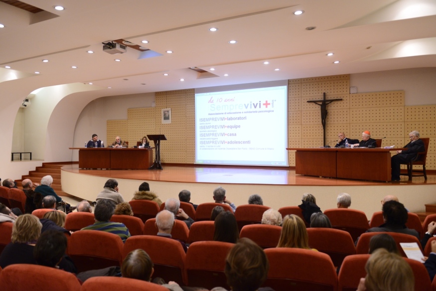 È una pastorale della sofferenza, quella che si racconta nell’Auditorium Beato don Giacomo Alberione, gremito di gente di ogni età per i dieci anni dell’Associazione “iSemprevivi+ Onlus”, che dal 2005 si occupa di educazione e solidarietà psicologica per adolescenti e giovani segnati dal disagio mentale. Accanto al cardinale Scola, che svolge la sua Lectio magistralis dedicata a «Dolore, isolamento e comunità», ci sono don Domenico Storri – per tutti “Dondo”, psicologo e psicoterapeuta, fondatore e anima dell’Associazione – e don Sante Torretta, parroco della vicina parrocchia di San Pietro in Sala, dove tutto è nato e che rimane il vero punto di riferimento dell’attività dei “Semprevivi”. «Una porzione di Chiesa per cui tale realtà e la presenza dell’Arcivescovo sono un dono grande», dice don Sante in apertura.