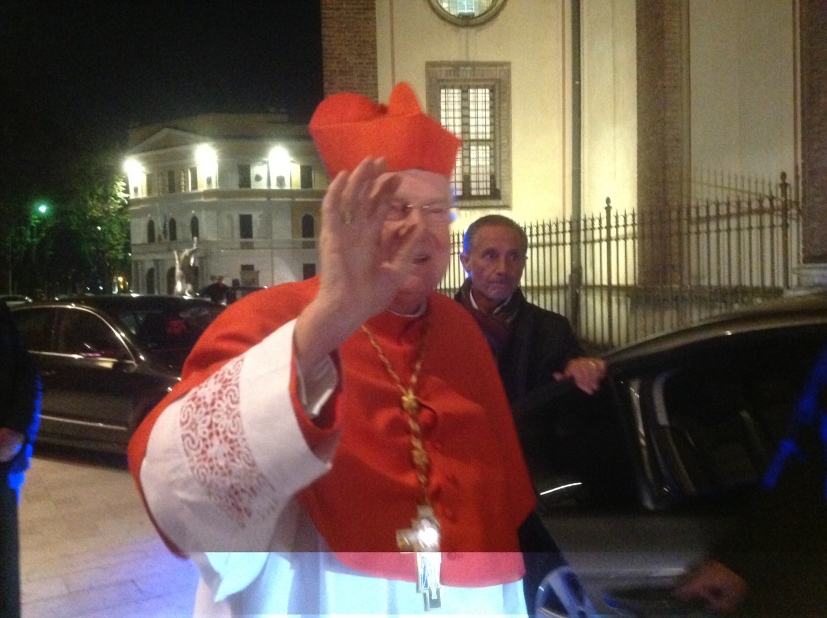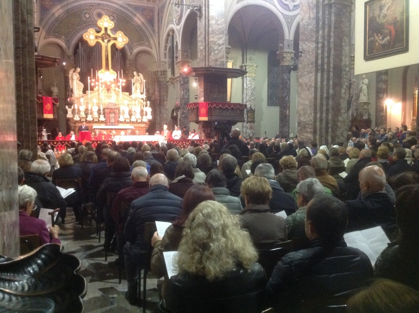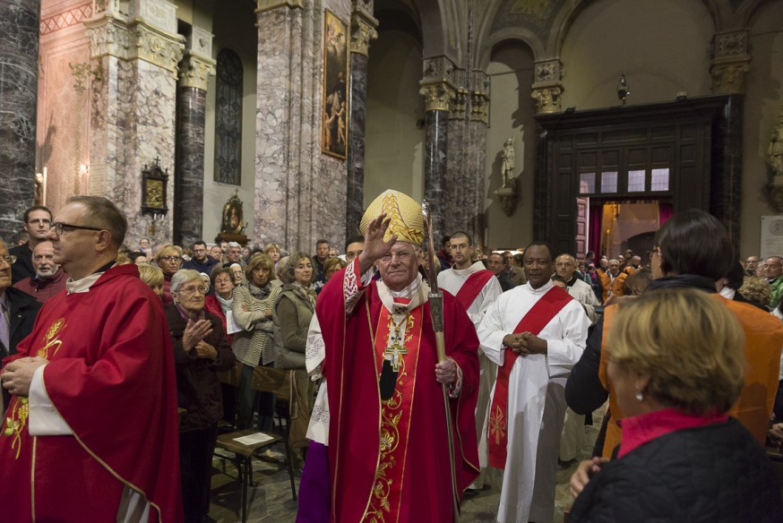 Le parole con cui il cardinale Scola si rivolge ai fedeli, nella breve sosta che compie nella basilica di San Magno, dopo averne ammirato le preziose pitture e pregato presso le reliquie del Santo, sono come la sintesi dell’intero messaggio che l’Arcivescovo lascia a Legnano. Si  apre, così, la Missione Francescana Cittadina con la consegna del Mandato ai Missionari. Proprio da San Magno, infatti, si avvia il cammino: davvero tanta la gente che partecipa, dai più piccoli con le lanterne alle autorità con il sindaco; dai sacerdoti e religiosi alla rappresentanza della Comunità albanese che qui conta oltre 1300 presenze. Si arriva alla parrocchia di san Domenico in cui si fatica a entrare, perché la chiesa è già gremita. In un clima gioioso si avvia l’Eucaristia, presieduta dall’Arcivescovo e concelebrata da oltre 50 sacerdoti: disposti sull’Altare maggiore e, come una corona, ai suoi piedi, ci sono i presbiteri delle 8 realtà della città, naturalmente i Francescani, con il coordinatore nazionale delle Missioni al Popolo dei Frati minori d’Italia, fra’ Giovanni Paolo Bianco, gli impegnati nella Missione, il decano del Decanato Legnano, don Fabio Viscardi e il prevosto, monsignor Angelo Cairati. È lui che, nel suo saluto di benvenuto, dice: «Come Chiesa siamo minoranza, tuttavia, lungi dall’abbatterci, vogliamo essere minoranza creativa. Dunque, il nostro intento dare testimonianza: questo è il senso profondo della Missione Cittadina».