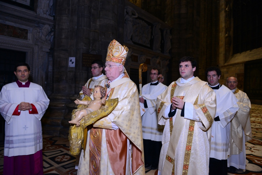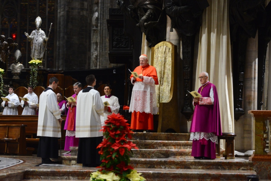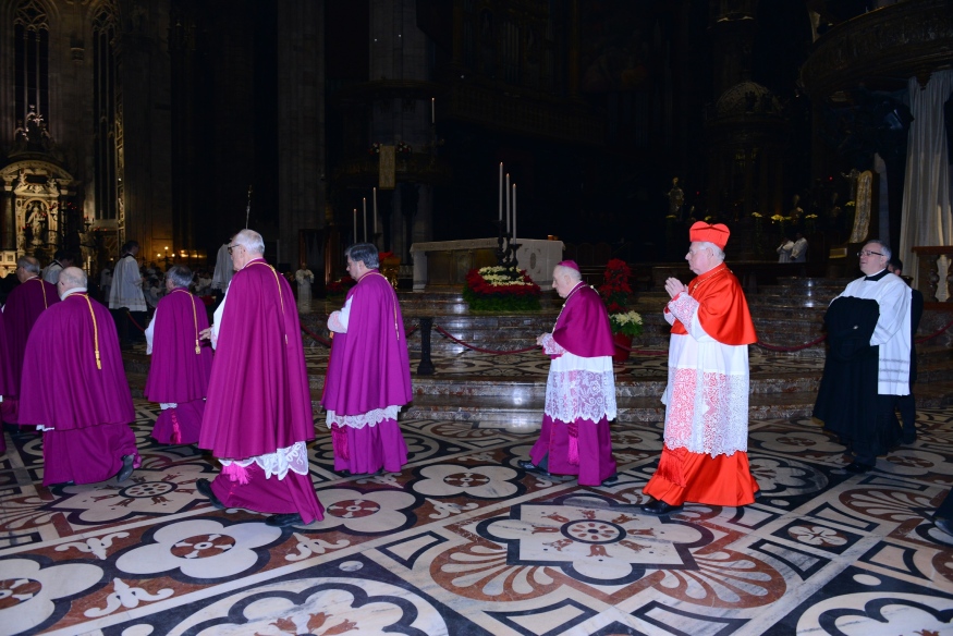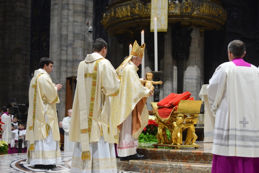 «La gloria del Signore è la luce vera che illumina ogni uomo e la Notte santa». Notte di Natale, nella quale, in un Duomo gremito di migliaia fedeli, il Cardinale presiede la Veglia di preghiera che, con i suoi tradizionali Salmi, la Lettura dal profeta Isaia e la l’ambrosianissima “Esposizione del Vangelo secondo Luca” di sant’Ambrogio, precede, mentre scocca la mezzanotte, la Messa. Accanto all’Arcivescovo, che porta tra le mani la raffigurazione lignea del Dio Bambino deponendolo nella “culla” posta ai pedi dell’altare maggiore, concelebrano il Rito i Canonici del Capitolo Metropolitano e alcuni membri del CEM. Dall’ascolto della Kalenda natalizia alle Letture, con il Prologo del Vangelo di Giovanni, tutto indica “la luce che splende oggi su noi, poiché per noi è nato il Signore”, come dice il Canto d’ingresso. “Lui, Unigenito del Padre, pieno di grazia e verità, per cui il mondo è stato fatto”.