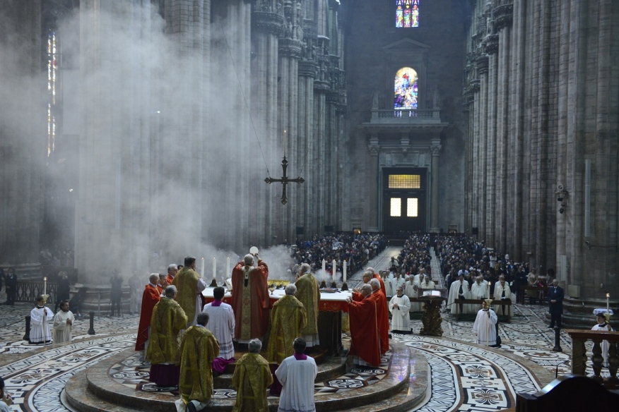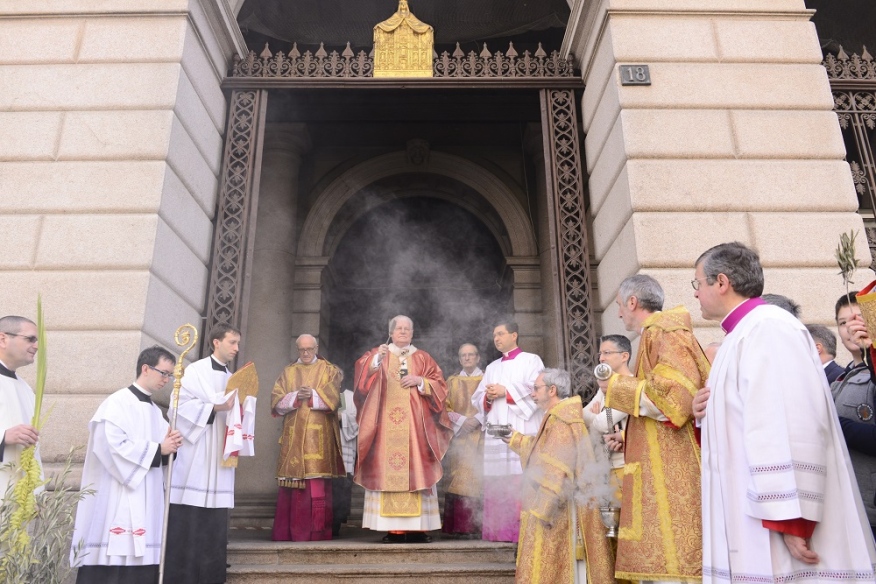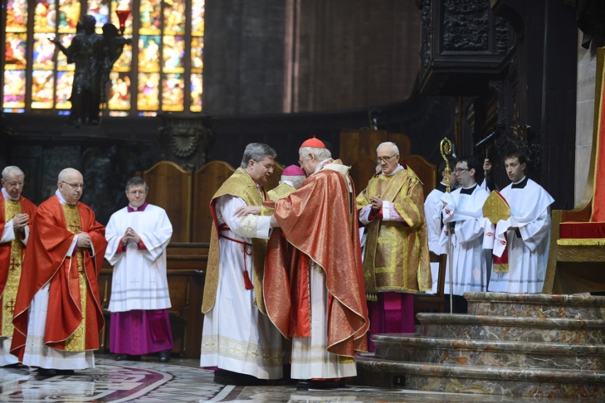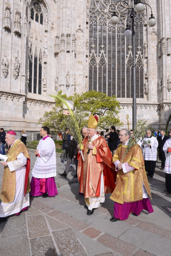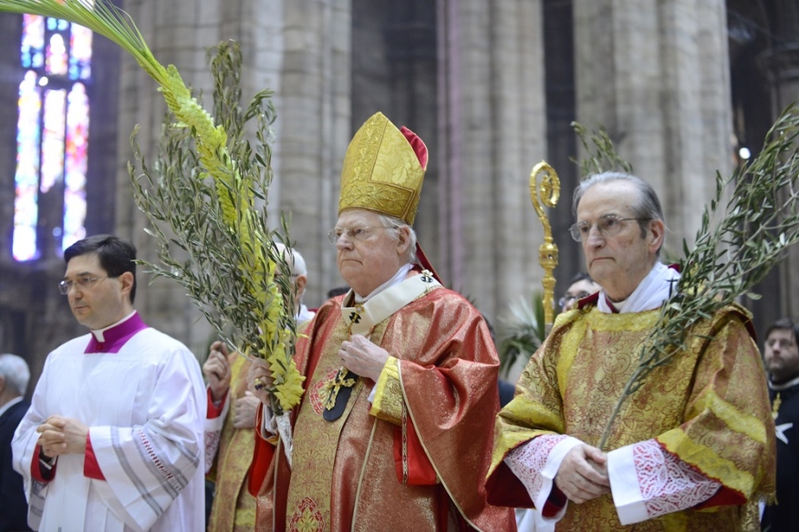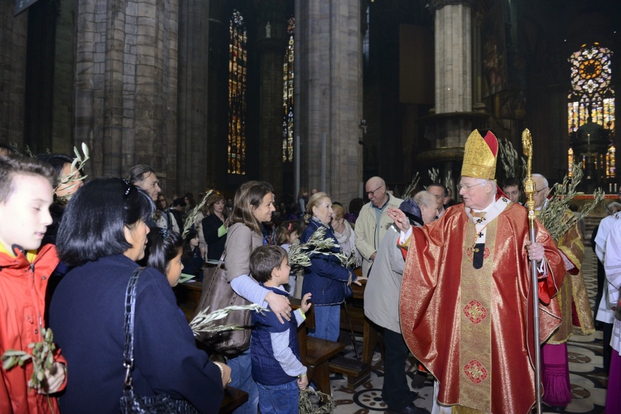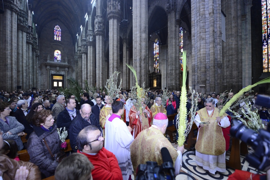 È la domenica delle Palme e, dopo aver benedetto gli ulivi e le palme davanti alla chiesa di Santa Maria in Camposanto, il cardinale Scola muove in processione verso il Duomo con il Canonici del Capitolo Metropolitano, i rappresentanti degli antichi Ordini cavallereschi e delle Confraternite e seguìto dalla gente, moltissima, con tanti bambini e intere famiglie. Tra loro i cento volontari che operano per sostenere il “Fondo Famiglia Lavoro”, i settecento ragazzi, con i loro genitori, delle scuole paritarie “La Zolla” di Milano, gli oltre cento studenti del “Collegio San Carlo”. Insomma, tutti quelli che la Cattedrale sembra non riuscire a contenere e che continuano ad affollarsi tra le navate mentre il Canto dei Dodici Kyrie sottolinea la Solennità della Celebrazione che è il portale – così lo definisce l’Arcivescovo – che introduce alla Settimana Santa. Settimana che, non a caso, il Rito ambrosiano, chiama «autentica», per la sua esemplarità.