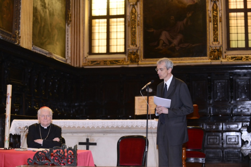 «Mi è parso», specifica l’Arcivescovo, «di trovare nel testamento del Venerabile questo stesso convincimento, specie nel paragrafo in cui lega l’amore vicendevole alla testimonianza». Testimonianza che è molto di più di “un buon esempio”, seppur necessario, e che chiama in gioco per intero il carattere dell’“indole secolare del laico” come è indicata dal Magistero. «Anzitutto, la Chiesa stessa possiede una dimensione secolare, perché è inviata da Cristo al mondo, mondo alla cui santificazione i laici sono chiamati a contribuire nella loro condizione ordinaria sociale». Si radica qui quel concetto della testimonianza di cui già parlava Romano Guardini – “La Chiesa deve rinascere dalle anime” , ossia dalle persone -, e che ben aveva compreso il Professore, infatti, ancorato a un’idea di secolarità immersa nella storia concreta. Come indica il Magistero di papa Benedetto, «ciò vuol dire assumere e saper interpretare le condizioni che ogni epoca della storia propone: pensiamo solo alla fase di trapasso di millennio che stiamo vivendo dopo l’epoca delle ideologie e la caduta dei Muri. L’indole secolare deve misurarsi con fenomeni come il meticciato, le neuroscienze, la pervasività della finanza, il non volere veramente risolvere il problema della fame e della povertà. Occorre riscrivere nell’oggi della storia questa indole». Una scelta, questa, perseguita dalla nostra Chiesa attraverso il racconto di ciò in cui crediamo, di Gesù come Vangelo dell’umano, del Dio vicino nel campo che è il mondo.