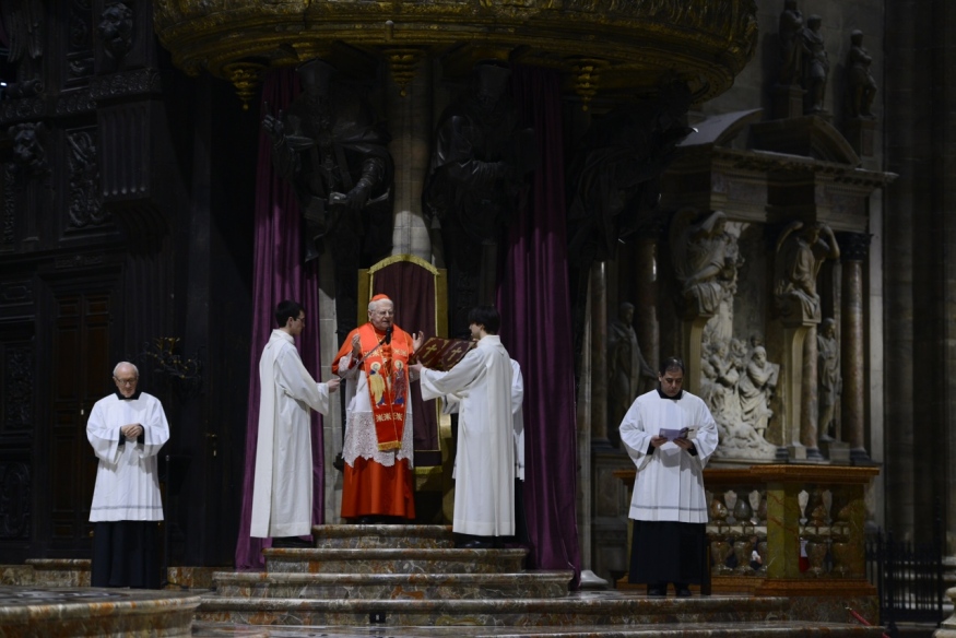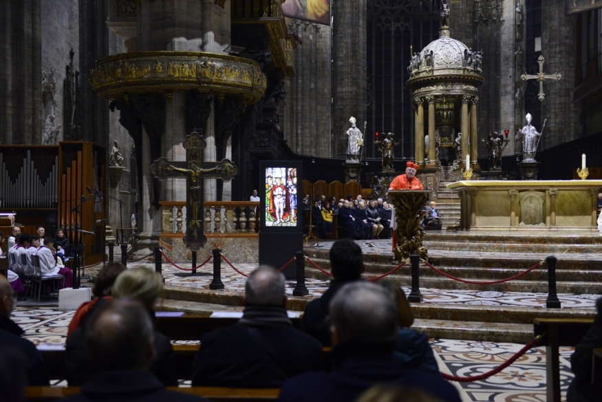 Si prega, si riflette in silenzio, si ascoltano brani del Vangelo di Marco e del Libro delle Lamentazioni, gli attori Luisa Oneto e Jonathan Ziello leggono le testimonianze del gesuita François Varillion, di Romano Guardini e della poetessa Elena Bono. La grande Croce di Ariberto, simbolo di ambrosianità millenaria, e il prezioso, cinquecentesco antello 24 della Vetrata 2 del Duomo – posti per l’occasione sull’Altare maggiore – sono le icone artistiche di questo «Ecce homo» che ha il volto triste, ma libero, del Cristo di misericordia.