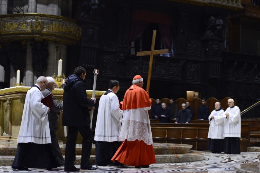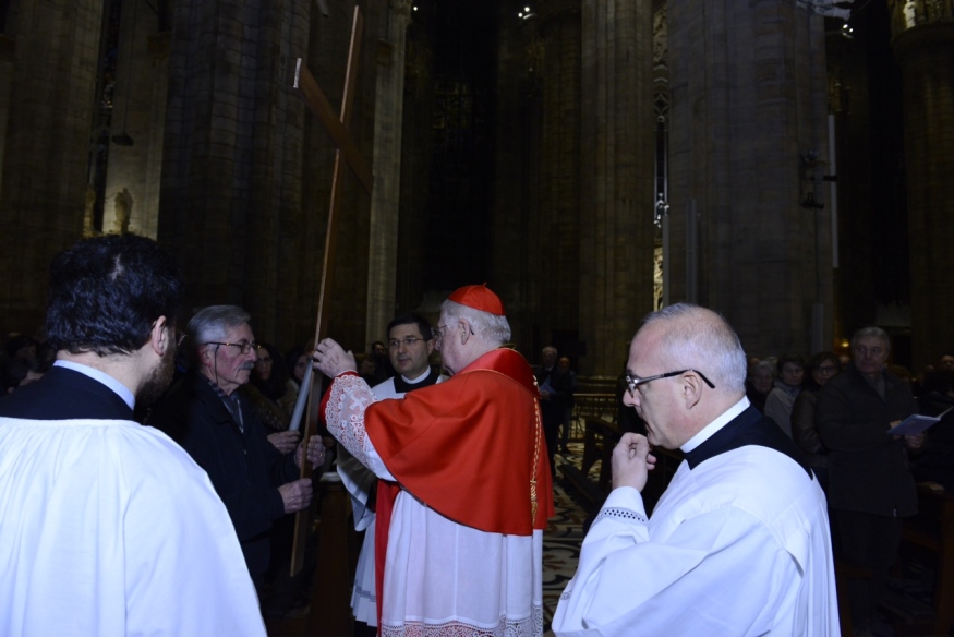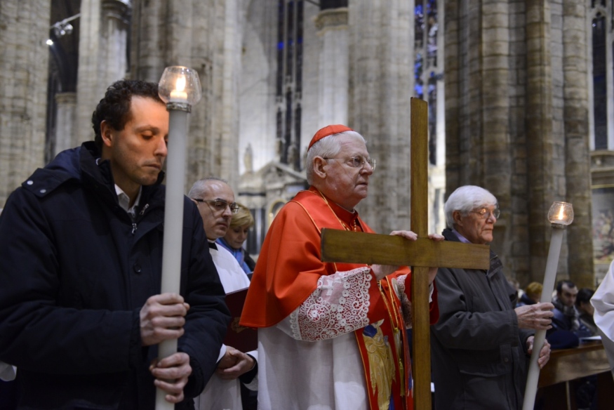 Nelle parole del cardinale Scola, la prima Via Crucis in Duomo del Cammino catechetico proposto a tutti per la Quaresima 2016 si fa ammonimento e richiamo perché il tempo privilegiato che conduce alla Pasqua possa divenire tempo di conversione del cuore e di rinascita nel perdono di Dio. Quel perdono che – come disse papa Francesco nel 2014 – «sono le piaghe stesse del suo Figlio innalzato sulla Croce». Preghiera che l’Arcivescovo cita indicando la necessità di «andare nelle sue piaghe, perché lì possiamo chiamare per nome il peccato, non sfuggirlo e non ridurlo a un usurato elenco imparato da bambini. Lo possiamo chiamare per nome perché sappiamo dove si trova: non più caricato sulle nostre spalle, come la soma insopportabile di una maledizione, ma sulle Sue».