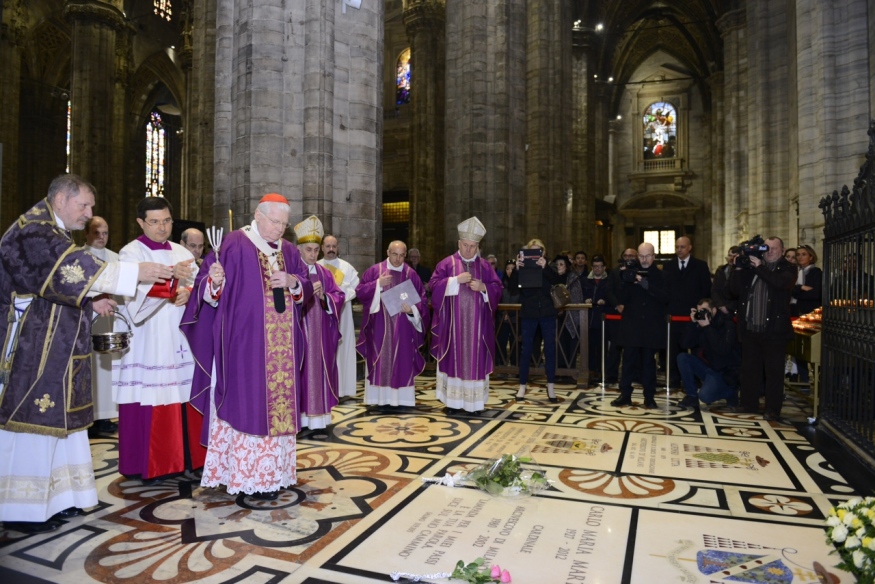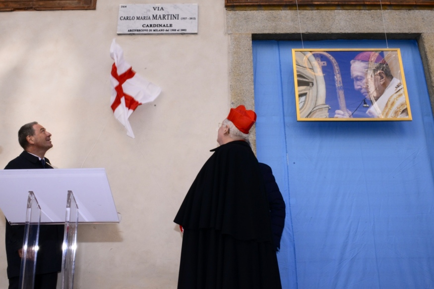 A conclusione della Celebrazione, la preghiera è ancora tutta, sulla sua sepoltura, per il cardinal Martini, con la benedizione della lapide da parte dell’Arcivescovo, il silenzio composto e commosso del sindaco e dei parenti, con la presenza di tutti i Concelebranti e della gente. Quella a cui si aggiungono in tanti per lo scoprimento della targa che poco dopo, inaugura ufficialmente la nuova intitolazione di via Arcivescovado, d’ora in poi, via cardinale Carlo Maria Martini. Sul palco ci sono il cardinale Scola, il sindaco, il nipote Giovanni Facchini Martini, le autorità, tra cui membri del Consiglio comunale e regionale, il già sindaco Albertini, magistrati, sacerdoti, esponenti di primo piano della società civile, il responsabile della Città metropolitana: idealmente un’intera Milano che rende omaggio a colui che è stato defino un profeta.