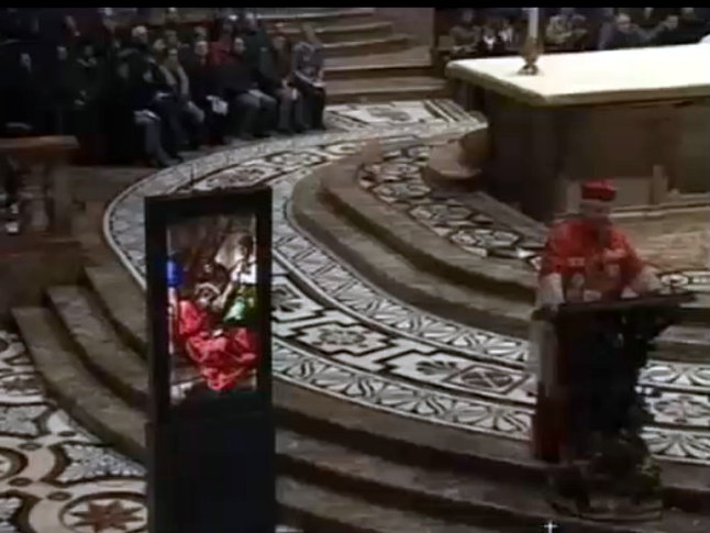 E, poi, dopo l’esempio insuperabile dell’amore materno e virginale, il secondo volto di donna della misericordia, la Veronica: «Cosa c’è di più femminile della capacità di svettare sul maschio in compassione? Guai se la donna perde questa capacità di “patire-con”, che piaccia o no alla mentalità dominante. È questo lo sguardo attraverso cui la donna consistente e matura spacca ogni seduzione, libera l’uomo dalla sua fragilità e, se è sposa, porta figli, realizzando quell’inizio di società potente, che può apparire disprezzato a prima vista, ma che non lo è perché l’opinione dei mass media non è quella del popolo». Il monito è a «rompere con coraggio la lontananza dalla persona fisica di Gesù nella sua trasposizione eucaristica».