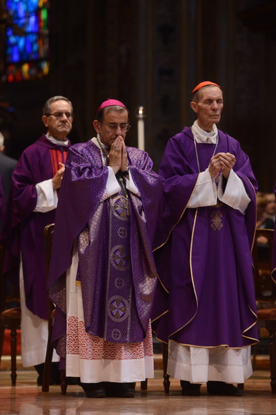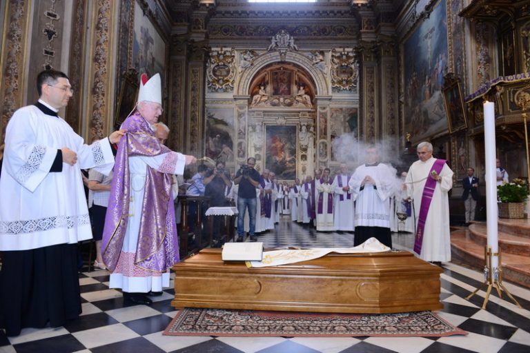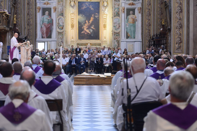Al suo arrivo, nel Santuario già gremito, il cardinale Scola sosta in breve silenziosa preghiera davanti al feretro, posto ai piedi dell’altare, per terra, secondo tradizione; si recita il Rosario con i Misteri della Gloria. In apertura del Rito il Cardinale stesso asperge e incensa il corpo del defunto. Le tre Letture, anch’esse peculiari delle esequie dei Presbiteri, con i brani della Passione secondo Luca, secondo Matteo e secondo Giovanni, preludono all’omelia profonda e commossa.