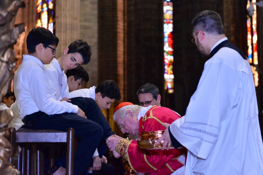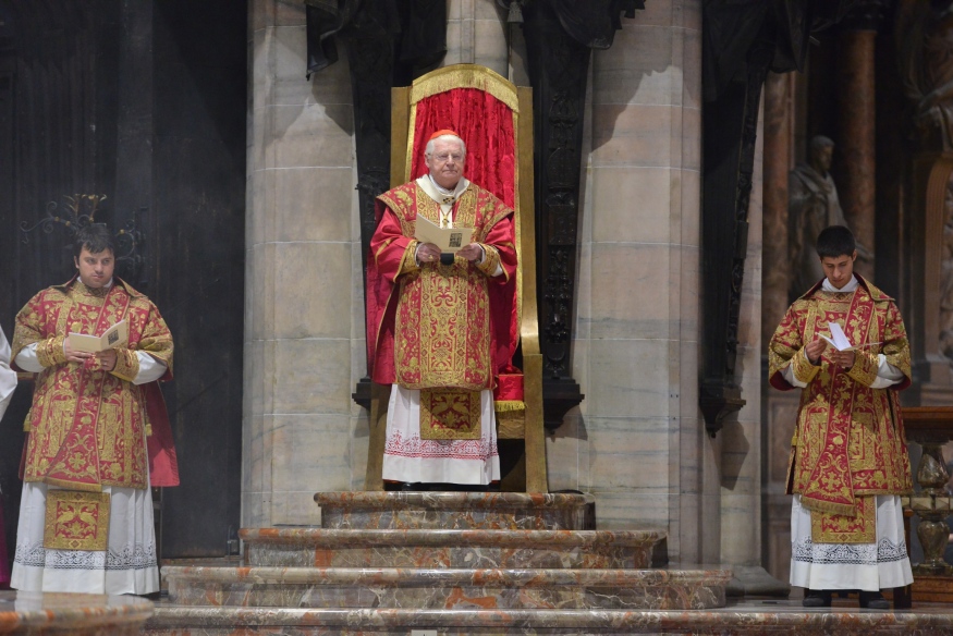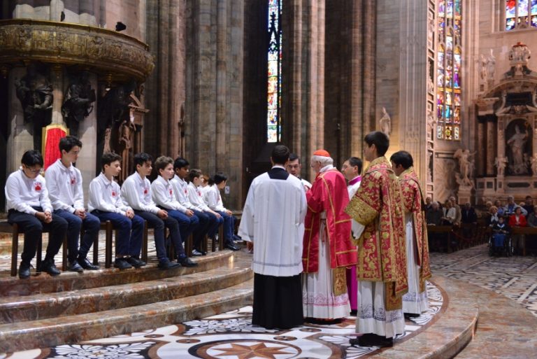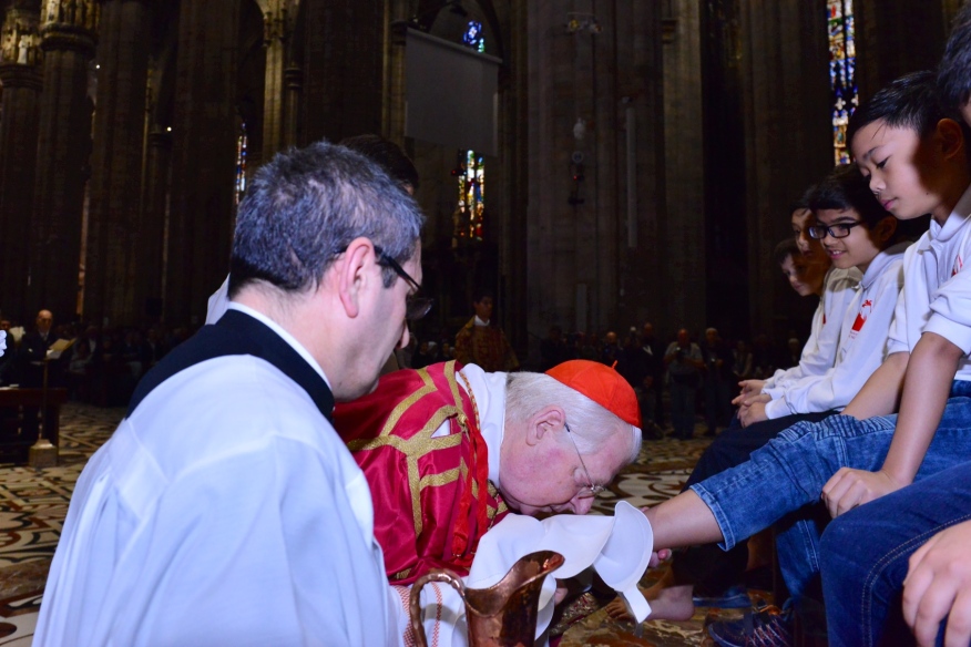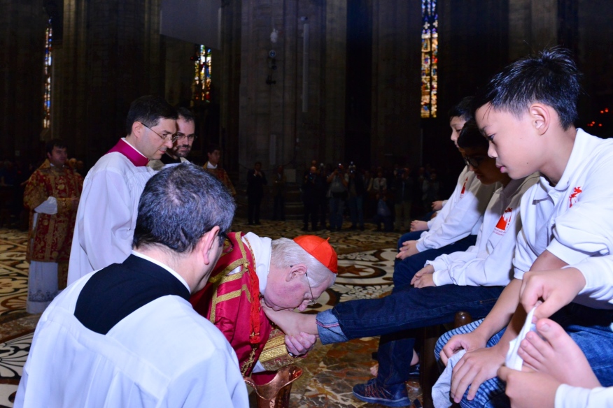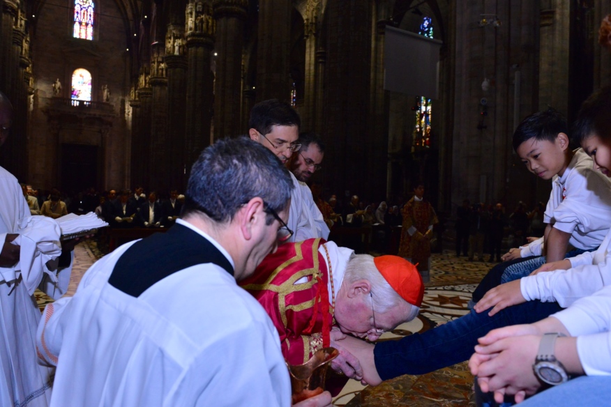 Nella penombra, il cardinale Scola, che ripete il gesto di Gesù nel corso dell’Ultima Cena, compie il Rito della Lavanda dei piedi su dodici piccoli cantori della Schola Cantorum della Cattedrale. Si apre così, in Duomo, il Triduo Pasquale con la Messa Vespertina in “Coena Domini” che ripercorre i momenti iniziali della Passione del Signore. Il Rito della Luce, a indicare l’irrompere della luce della Grazia, il canto, la tradizionale Lettura del profeta Giona, della Prima Lettera ai Corinzi, con il racconto dell’istituzione dell’Eucaristia, ma, soprattutto, della prima parte della Passione secondo Matteo – che proseguirà cronologicamente nella strutturazione liturgica, peculiare del Rito ambrosiano – immergono in profondità i tanti fedeli, riuniti in Cattedrale, nei tragici fatti e nei giorni santi di cui si fa memoria.