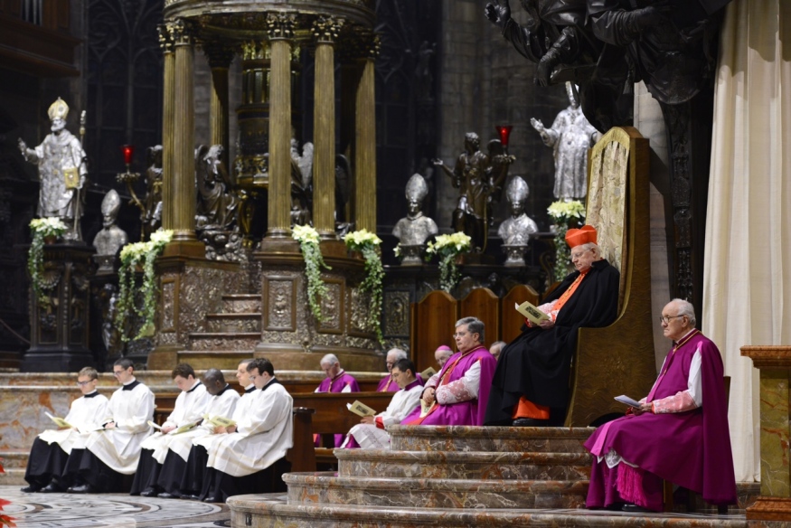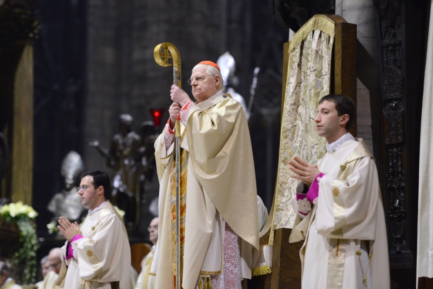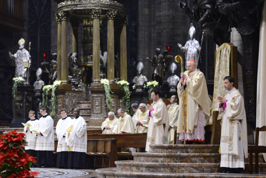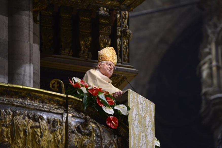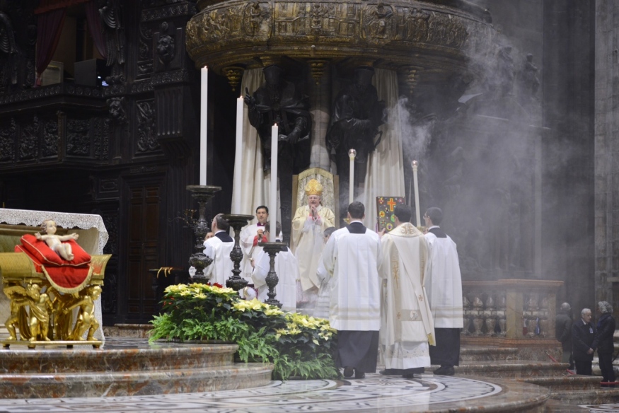 È la Celebrazione eucaristica presieduta dall’Arcivescovo nella Notte di Natale, in cui tutto parla di «questa nascita clamorosa», la luce stessa che inonda la Cattedrale, la Parola di Dio, le Letture, tra le quali la tradizionale, ambrosianissima, “Esposizione del Vangelo secondo Luca” di sant’Ambrogio, proclamata nella Veglia di preghiera che precede l’Eucaristia. Nella cui processione iniziale il Cardinale – accanto a lui concelebrano alcuni suoi stretti collaboratori e i Canonici del Capitolo metropolitano – porta tra le mani la raffigurazione lignea del Dio Bambino che depone nella “culla”, posta ai pedi dell’altare maggiore. È “la luce che splende oggi su noi, poiché per noi è nato il Signore”, come dice il canto e suggeriscono la Kalenda natalizia e lo splendido brano evangelico. «Contemplando il mistero del Dio bambino, come anche noi stiamo facendo qui numerosi in questa Notte santa, la Chiesa riconosce la verità delle parole del prologo del Vangelo di Giovanni, “Veniva nel mondo la luce vera, quella che illumina ogni uomo”», riflette, infatti, l’Arcivescovo, che subito aggiunge: «Tutti i pericoli esterni e interni a noi e la ferocia che minacciano i nostri giorni, spesso lasciandoci l’impressione di barcollare nel buio, non possono cancellare il fatto che nella storia degli uomini è entrata la luce vera che illumina ogni uomo».