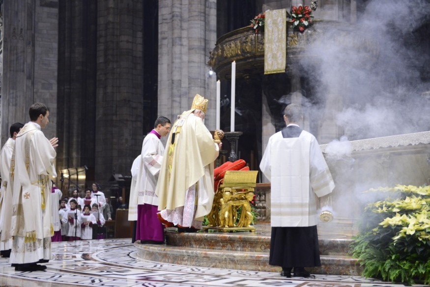 Da qui la certezza, con uno sguardo rivolto anche alla metropoli: «Nessuno di noi è solo. Pensiamo ai quasi cinquemila che non hanno posto per dormire a Milano e non l’avranno nemmeno, forse, questa notte: neppure loro sono soli, perché mille nostre mani si tendono verso queste persone e, anche se siamo inadeguati a rispondere al bisogno, tuttavia ci sentiamo mossi. Il Signore bambino ci accompagna, ci sorregge, ma soprattutto – chi non lo ha provato? – ci rialza permanentemente, come fa in questa Notte santa. Per questo siamo venuti in Duomo accettando anche il sacrificio della paura e dei necessari controlli; per questo oggi celebriamo il Natale del Salvatore che è il natale della nostra salvezza, il compimento del nostro andare contro la morte, del durare per sempre». E questo appunto perché «in quella notte a Betlemme si è aperta la strada che ci permette di camminare nella luce vera». Dono gratuito di redenzione, al quale dobbiamo rispondere con un “sì” più che mai necessario oggi, spendendo la nostra esistenza amando Dio, i nostri fratelli e il Creato.