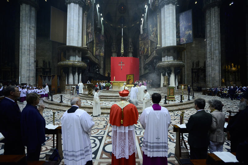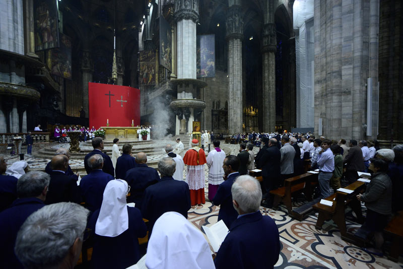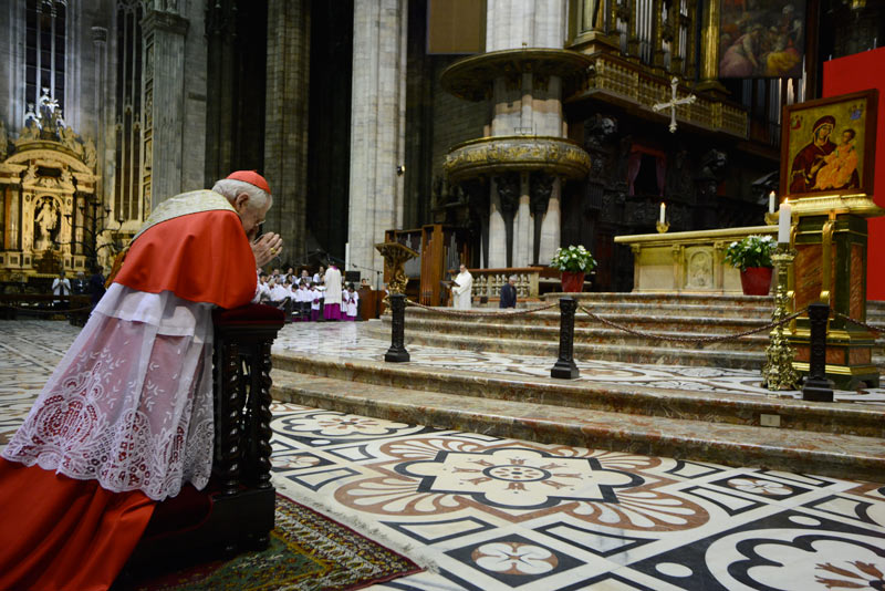 «Noi pensiamo di essere gli unici artefici della nostra azione. Così, solo quando siamo schiacciati dal peso delle fatiche, guardiamo “in alto”. Eppure Dio è vicino a noi sempre. E tanto più la nostra libertà tende a smarrire il centro tanto più questo abbraccio di Gesù è tenero e forte». L’Arcivescovo di Milano, il cardinale Angelo Scola, lo ha ribadito ieri sera in uno dei passaggi più intensi della sua meditazione durante il Rosario meditato. Nel Duomo di Milano tanti fedeli si sono stretti attorno al Cardinale per la celebrazione.