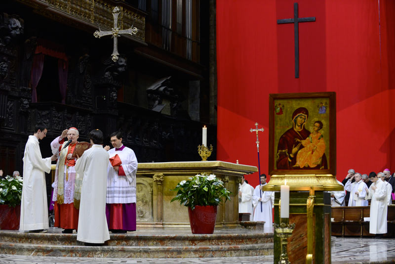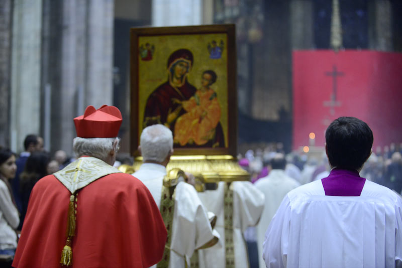 Un affidamento, la preghiera, un atto di consegna alla volontà di Dio: «C’è una consonanza profonda tra la risposta di Maria e la preghiera di Gesù. Tra il “Non come voglio io, ma come vuoi tu” e l’“Eccomi, sono la serva del Signore”». Ecco allora il senso profondo del “Sia fatta la tua volontà, come in cielo così in terra”, «quella grazia e libertà, quell’obbedienza eroica di Maria» di fronte al figlio che muore. Questa altissima esperienza di affidamento si concretizza per Scola nel quotidiano, quando il matrimonio è vissuto come discepolato «gli uni degli altri». Ma è anche il fondamento imprescindibile per l’educazione, che scaturisce dalla «profonda sintonia e osmosi tra allievo e maestro».E per questo l’Arcivescovo rivolge un invito a tutti i fedeli: «Non blocchiamo Gesù fuori dalla porta del nostro cuore».