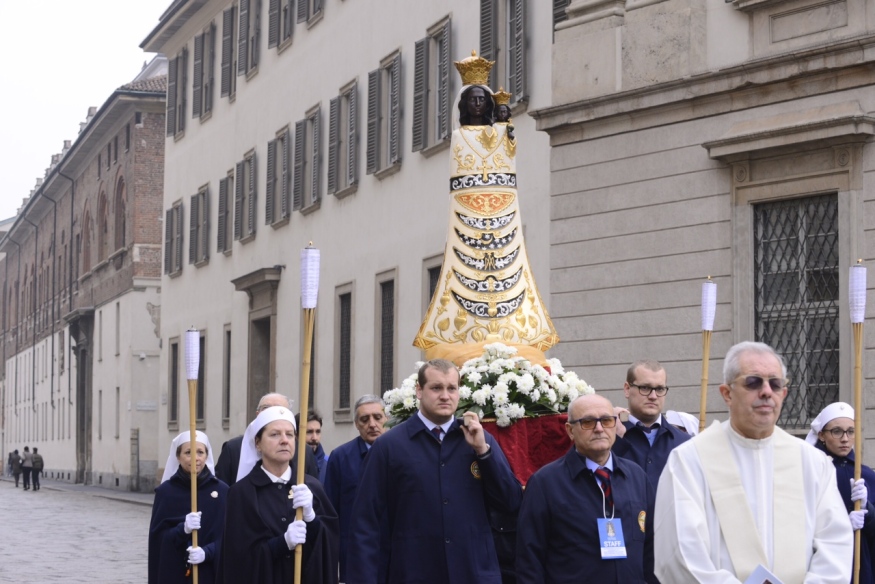 A tutti si rivolge, nella sua omelia, il Cardinale: «È con gioia che vi accolgo in questa immensa Cattedrale al termine del lungo e articolato pellegrinaggio nel quale la statua ha sostato in chiese e santuari, realtà associative e religiose. Il seguito che questo gesto ha avuto è un segno del grande amore per Maria che i fedeli che in questa nostra Italia conservano e anzi accrescono. Grazie alle Dame e i volontari che si prodigano non solo per i pellegrinaggi, ma anche per la progressiva cura e la tensione a trasformarsi in un’associazione vitale di fedeli, che permetta di vivere una fede compiuta tanto più necessaria, oggi, in tempi che tutti percepiamo particolarmente difficili e delicati. Interpreto la risposta al vostro pellegrinaggio come un dono della Madonna e un segno che il manto, espressione della misericordia del Figlio suo che ci tiene tutti uniti, si è ulteriormente allargato».