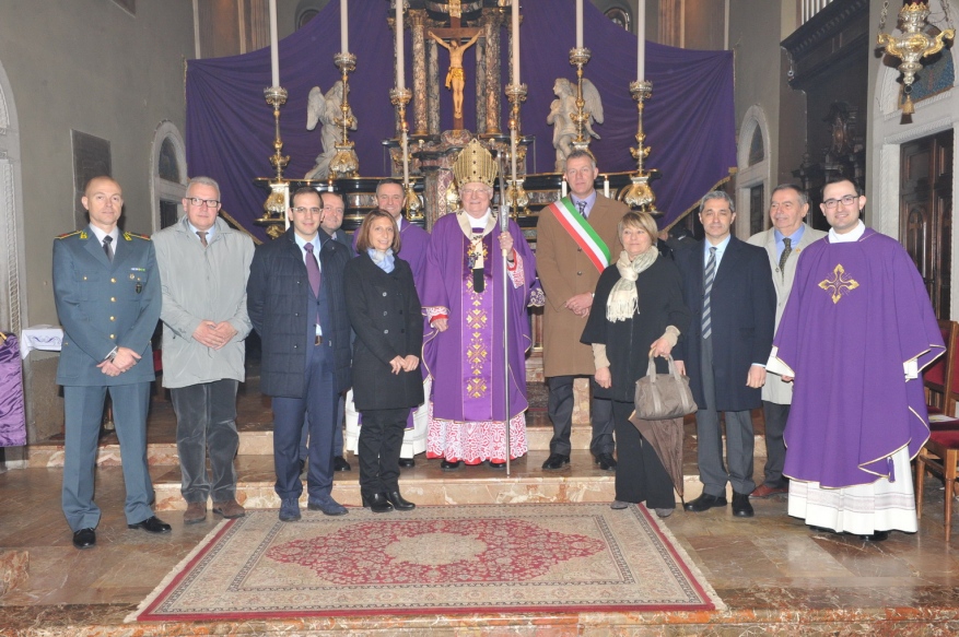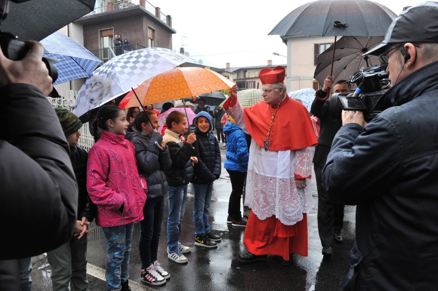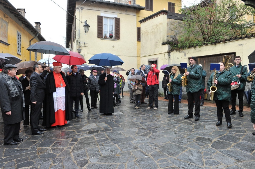 Lo suggerisce e lo dice nella bella e antica Collegiata prepositurale di San Vittore Martire ad Arcisate, dove presiede l’Eucaristia, concelebrata dai sacerdoti del Decanato di Valceresio che incontra la termine della Messa. Ed è appunto il parroco e decano, il canonico don Giampietro Corbetta, a dare il benvenuto all’Arcivescovo, sotto una pioggia battente e per nulla primaverile. La banda musicale di Arcisate, il sindaco, Angelo Pierobon, il Consiglio comunale, i rappresentanti delle Associazioni e la gente accompagnano, come in una piccola processione, il Cardinale verso la chiesa sul cui raccolto sagrato ancora c’è spazio per un benvenuto musicale con la Banda di Brenno.