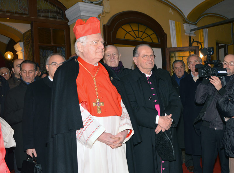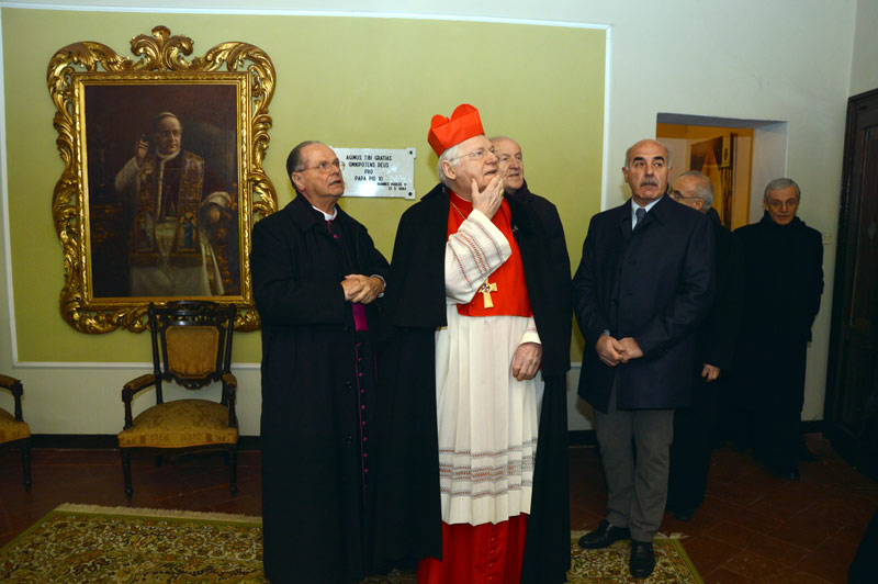 Poi, dopo un breve tragitto per le vie della Desio antica, l’Arcivescovo fa visita alla Casa natale di papa Pio XI, Achille Ratti, anche la locale banda gli tributa un omaggio musicale particolarmente riuscito e apprezzato dalla piccola folla che si è riunita intorno all’interno porticato d’epoca. Nella sala dove trovano posto, tra tanti cimeli preziosi, gli arredi originali dello studio del cardinale Ratti nei cinque mesi in cui fu arcivescovo di Milano, Giovanni Cucchiani, presidente della Fondazione “Casa natale Pio XI” e Agostino Gavazzi, presidente del “Centro Internazionale di Studi e Documentazione Pio XI”, spiegano il senso di un ricordo particolarmente sentito a Desio. E il Cardinale, allora, sul Libro d’Onore della casa museo, scrive: «Con viva gratitudine verso il grande papa Pio XI e quanti ne conservano la memoria con tanta cura».