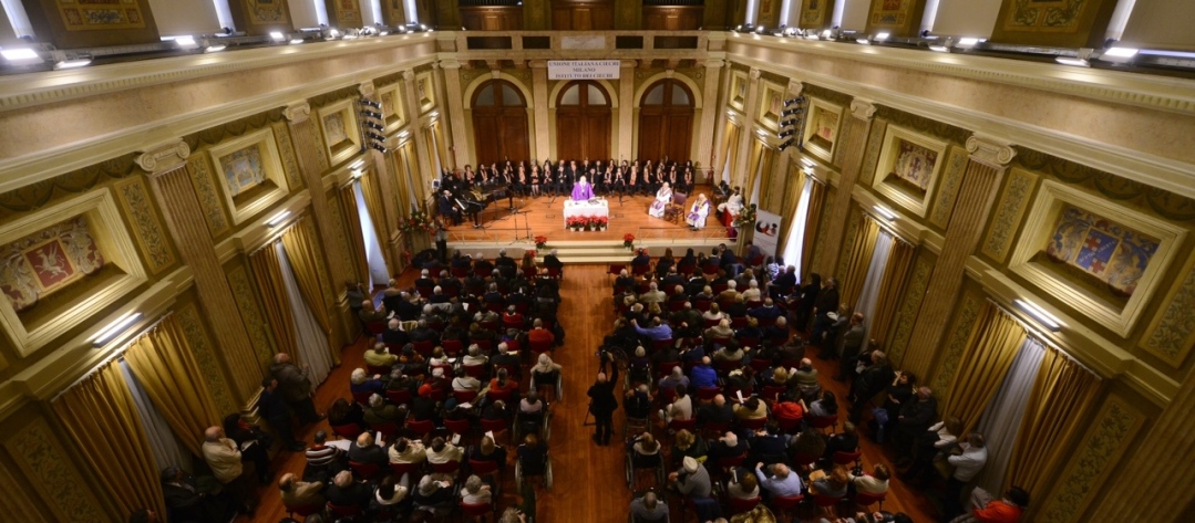 Dopo il segno della pace che l’Arcivescovo scambia con moltissimi dei fedeli, scendendo dall’altare e percorrendo l’intera sala Barozzi, prosegue la Celebrazione che si chiude con un momento suggestivo, quando William Bendini, presidente emerito dell’“Associazione Santa Marta” e dal 1976 nell’Unione, viene premiato in occasione della 57° Giornata Nazionale del Cieco.