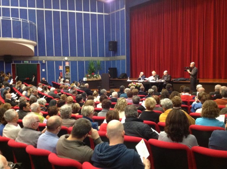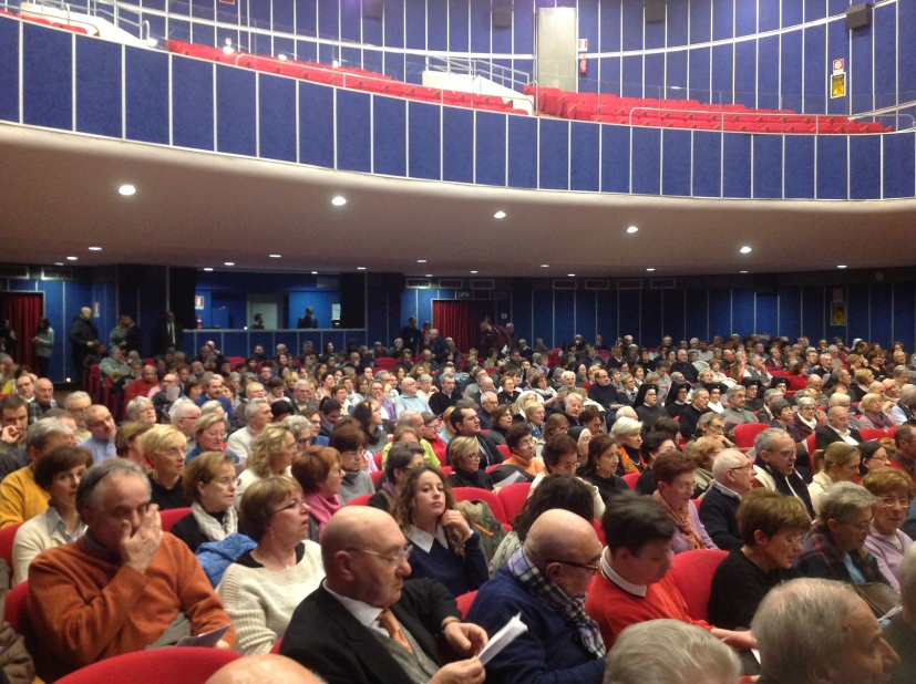 Nel Teatro Argentia” di Gorgonzola gremito, è il “popolo della Martesana” che saluta il cardinale Scola, giunto in questa popolosa zona a est di Milano per aprire la Visita pastorale al Decanato di Melzo, uno dei più grandi della Diocesi con le sue 25 parrocchie (molte riunite in Comunità pastorali), per un totale di circa 130 mila abitanti diffusi sul territorio di 13 Comuni. A dare il benvenuto, accanto al Vicario della Zona pastorale VI padre Michele Elli, il decano don Gilberto Orsi, che parla dell’Arcivescovo come «Pastore, fratello, amico, venuto a sentire un poco del nostro profumo di santità e di gioia e a condividere le gioie, le speranze e le ferite».
