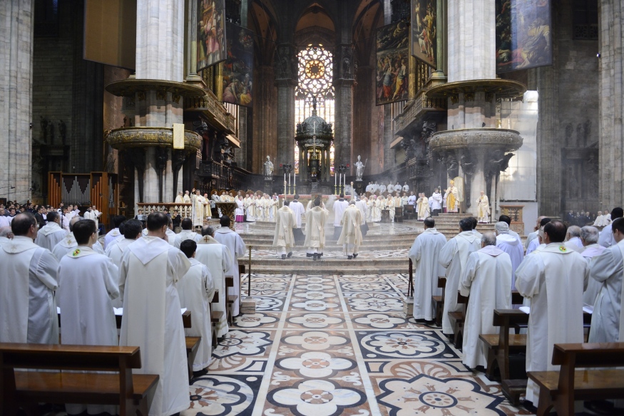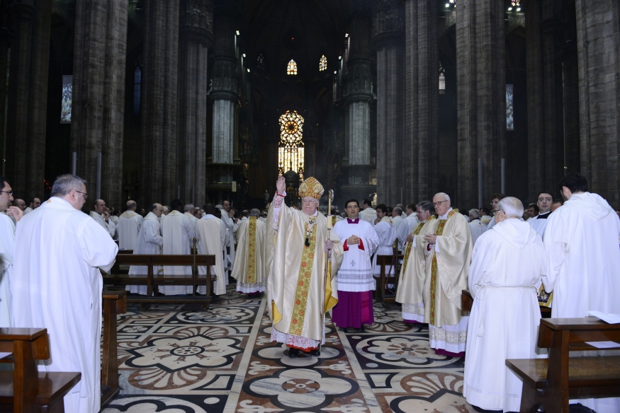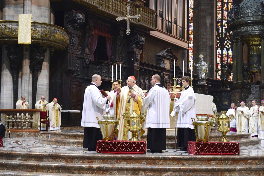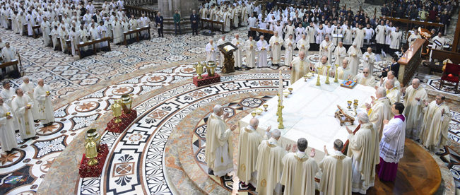 È la celebrazione in cui vengono benedetti gli Oli del Crisma, dei Catecumeni e degli Infermi, e in cui si celebra la comunione del Vescovo con i suoi presbiteri, evidente nel rinnovo delle promesse sacerdotali che segue l’omelia. Questo fa della Messa crismale, presieduta questa mattina in Duomo dal cardinale Scola e concelebrata dal clero ambrosiano, uno degli appuntamenti centrali dell’anno liturgico. Tra i concelebranti, l’Arcivescovo emerito, cardinale Dionigi Tettamanzi, il Vicario generale monsignor Mario Delpini, i Vescovi ausiliari e i Vicari episcopali.