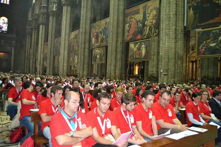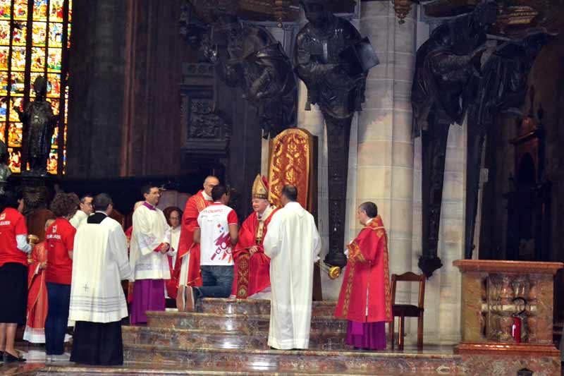 «Ho deciso di fare il volontario per mettermi in gioco, per fare un’esperienza forte di volontariato, di servizio, di gratuità, ma soprattutto di chiesa. È emozionante vivere da vicino questo importante appuntamento per Milano. Da questi giorni che verranno mi aspetto di lavorare molto, di crescere, di incontrare tanti volti, di ascoltare tante storie». La parole di Stefano, volontario ventiduenne di Bellusco, testimoniano la volontà dei 5.408 volontari che questa mattina si sono riuniti attorno all’Arcivescovo per ricevere il mandato e per celebrare insieme il Pontificale di Pentecoste. I volontari presenti non erano solo ambrosiani, vi erano molti giovani che provenivano da tutta Italia e alcuni anche dall’estero. Con questa mattinata è ufficialmente iniziata la settimana del VII Incontro mondiale delle famiglie che vedrà i volontari impegnati ad assistere i pellegrini durante tutti i numerosi appuntamenti previsti nel programma e accompagnare le delegazioni internazionali come autisti e ciceroni, saranno inoltre in servizio agli info point allestiti negli aeroporti, affiancheranno in generale il personale della sicurezza nei luoghi cruciali dell’Incontro. E ancora, aiuteranno l’ufficio stampa e gli educatori impegnati con i più piccoli al Congresso dei ragazzi. Daranno quindi un contributo fondamentale all’organizzazione dell’evento, il cardinale Scola ha per questo voluto ringraziarli in prima persona per il loro apporto. «Il VII Incontro Mondiale delle Famiglie è un’occasione privilegiata per contemplare all’opera il dono dello Spirito attraverso l’unità e l’urgenza missionaria che suscita in tutti noi – ha detto l’Arcivescovo durante la sua omelia -. In particolare per tutti voi volontari convenuti oggi in Duomo per celebrare insieme all’Arcivescovo la solennità di Pentecoste e invocare una particolare grazia dello Spirito per i giorni che ci aspettano. I diversi servizi che siete chiamati a svolgere in questi giorni sono tutti espressione dell’unità che noi viviamo. Tutta la Chiesa ambrosiana e la Chiesa universale stessa vi dicono fin da ora il loro grazie». Il cardinale Scola ha proseguito il suo discorso spiegando ai volontari il significato profondo dell’incontro delle famiglie, sottolineandone in particolare l’intento missionario al fine di capire insieme i fondamentali dell’esperienza quotidiana e quindi di abbattere tutte le inopportune separatezze. L’incontro con famiglie provenienti da più di 150 paesi sarà l’occasione privilegiata per scoprire il dono dell’unità. «Il VII Incontro Mondiale è un’occasione missionaria di primo ordine. Il tema dell’Incontro – La famiglia: il lavoro e la festa – ci aiuta ad identificare gli ambiti essenziali della nuova evangelizzazione, che chiede di farsi carico dei bisogni dei nostri fratelli uomini, incoraggiando noi stessi e loro a scoprire tutta l’altezza, la larghezza e la profondità del desiderio infinito che abita il cuore di ogni persona – ha continuato l’Arcivescovo -. Essere definitivamente amato da un padre, una madre, da fratelli sorelle e nonni e nonne, edificare il mondo, vivere tempi gratuiti e comuni: non è forse questo ciò che ogni nostro contemporaneo cerca formando una famiglia, lavorando e riposando? Se ripartiremo da una condivisione sincera e partecipe di questi “fondamentali” dell’esistenza quotidiana, che ci accomunano a tutti gli uomini, noi cristiani avremo l’occasione di abbattere steccati artificiosi e porre fine a indebite separatezze. Faremo risplendere il nostro contributo alla vita buona personale e comunitaria». Durante la celebrazione sull’altare del Duomo era esposto il mosaico del gesuita Marko Ivan Rupnik, il simbolo dell’incontro mondiale che rappresenta la famiglia per eccellenza, la Santa Famiglia, vicino al quale, al termine della messa, l’Arcivescovo e i volontari hanno fatto una preghiera allo Spirito Santo come segno d’inizio dell’esperienza che li attende.