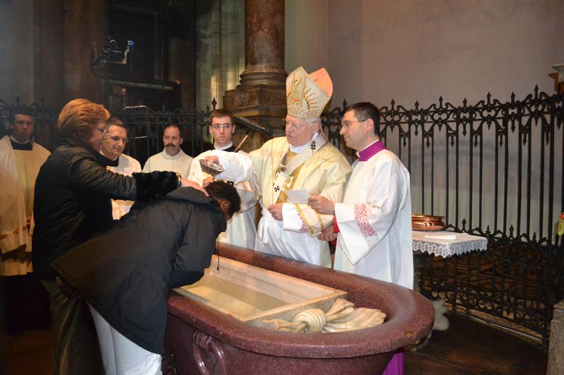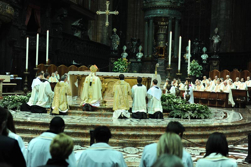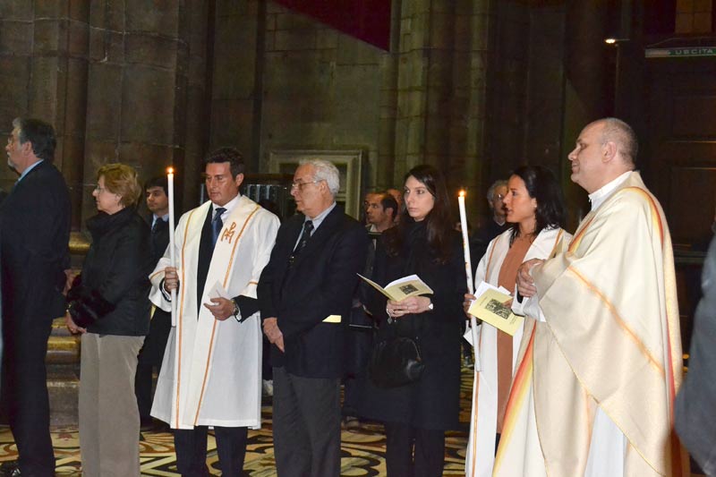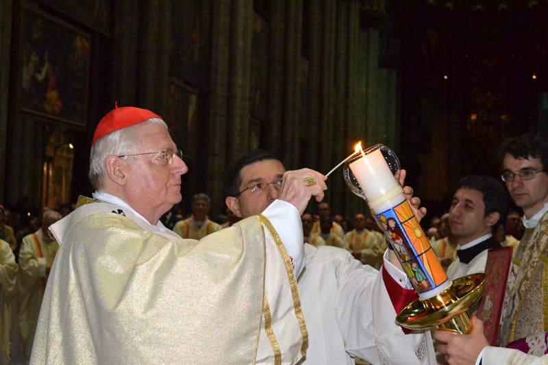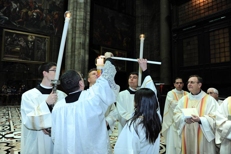 Parole di intensa e profonda gratitudine quelle dell’Arcivescovo verso di loro, una riconoscenza, non solo da parte della chiesa ambrosiana, ma anche da parte dell’intera città di Milano. «Siete i segni preziosi della primavera di tutta la società civile – ha proseguito il Cardinal Scola-. Voi siete un fattore decisivo della Milano nuova, della Milano futura che già sta disegnandosi. Con la vostra scelta di diventare cristiani ci ricordate che tutti noi, che vi facciamo corona in questa notte, siamo membra del Suo corpo, siamo la santa chiesa redenta dal Signore». I catecumeni presenti questa notte in Duomo, rappresentanti degli altri 150 che hanno ricevuto i Sacramenti dell’iniziazione cristiana in tutta la diocesi di Milano, diventano allora un esempio di cammino di fede per tutti i cristiani. «Vi accogliamo pieni di gioia – ha continuato l’Arcivescovo -, una gioia che fa eco a quella di questa notte di Pasqua, una gioia che magari non dirompe in danze, ma che si radica nel profondo del nostro cuore e vince. Vince su ogni tristezza, vince su ogni malinconia, vince su ogni paura, vince su ogni contraddizione. La gioia del Battesimo, della Confermazione e dell’Eucarestia che vi toccherà nel profondo, è la conseguenza più potente della gioia della santa Pasqua». La scelta dei catecumeni è un modello di vera vita cristiana perché richiama il significato più autentico della Pasqua, cioè l’accoglienza del dono di amore del Risorto che porta gioia, ma anche richiede assunzione di responsabilità nel portare la speranza del Vangelo a tutti gli uomini e le donne. «Il dono dell’annuzio del Risorto genera in tutti noi, a cominciare dal Vescovo, una precisa responsabilità a cui non possiamo, non potete, non potrete sottrarvi – ha concluso il Cardinal Scola -. Cercare ogni giorno con tutto il cuore, con tutta la mente, con tutte le forze il Suo volto benedetto, il volto del Crocifisso glorioso e risorto per poterlo comunicare a tutti i nostri fratelli uomini. Allora carissimi fratelli e sorelle questa diventa ora per noi l’urgenza suprema della vita, come ricorda anche il Vangelo di questa notte».