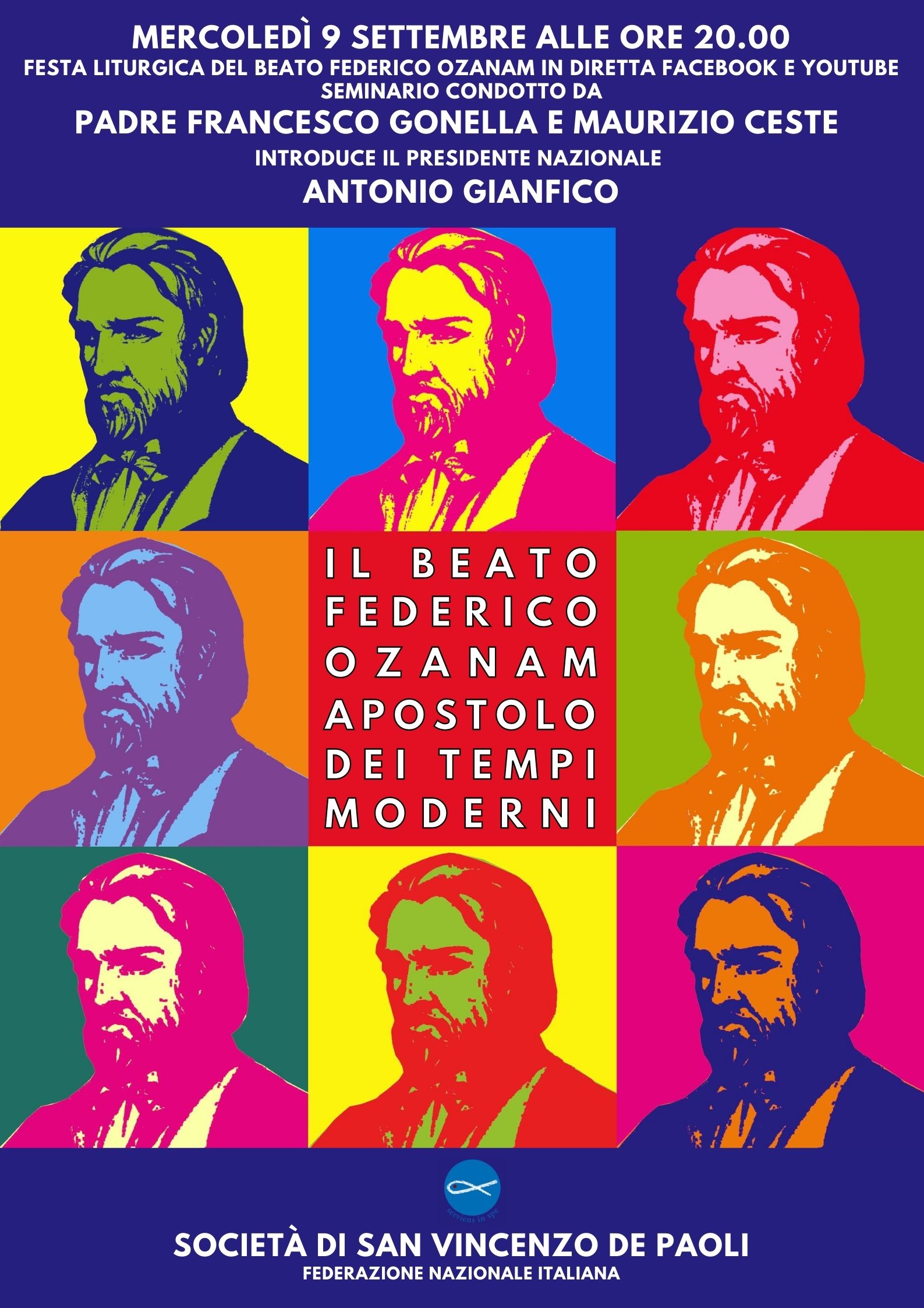 Proprio il 9 settembre padre Francesco Gonella, consigliere spirituale della Federazione italiana della Società di San Vincenzo De Paoli, e Maurizio Ceste, membro della Giunta nazionale, autore e curatore di opere sul Beato Federico Ozanam, condurranno un seminario online per presentare la figura del fondatore, come testimone di fede e di carità e come apostolo della cultura e della politica sociale. A introdurre l’evento, dal titolo «Il Beato Federico Ozanam, apostolo dei tempi moderni», sarà il presidente della Federazione nazionale Antonio Gianfico. Il seminario verrà trasmesso alle 20.00 in diretta sui social network Facebook e Youtube.