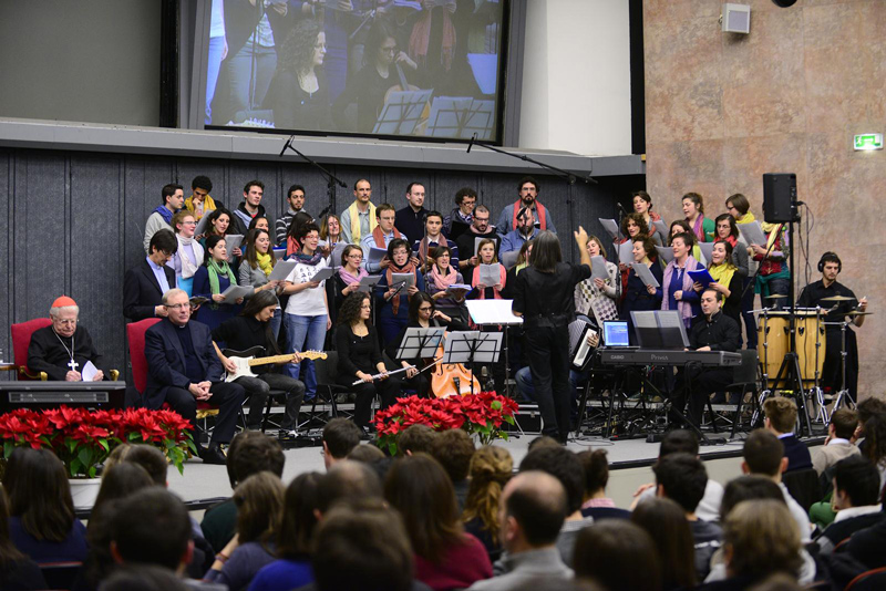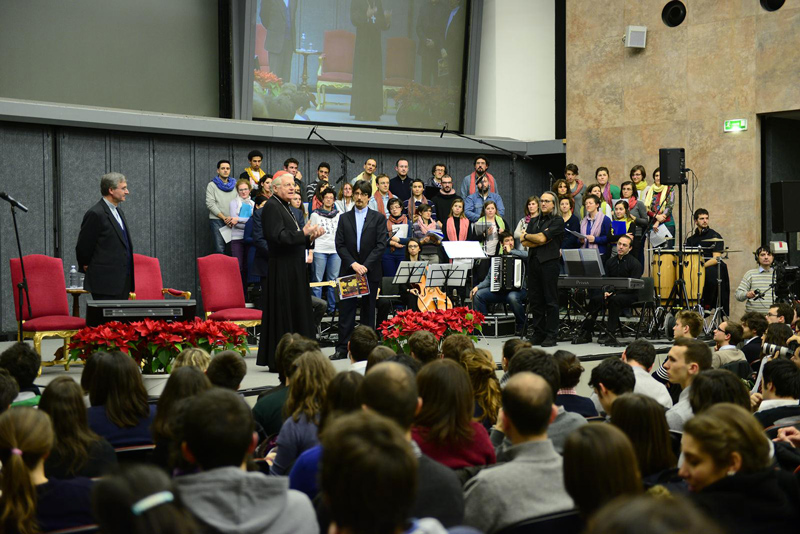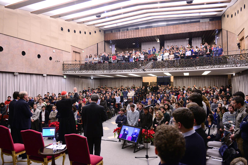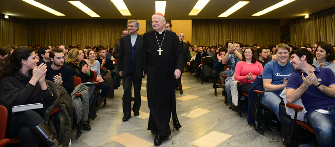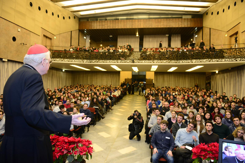 La serata è stata condotta da don Bortolo Uberti, cappellano dell’Università Statale e Bicocca, ed è stata introdotta da monsignor Pierantonio Tremolada, vicario episcopale per l’Evangelizzazione e i Sacramenti. Dopo una scheda filmata di Annamaria Braccini sulla realtà universitaria milanese (9 atenei e 37 residenze cattoliche in totale, per oltre 200 mila studenti), il giovane Lorenzo ha posto all’Arcivescovo una prima domanda su come possiamo incontrare Gesù e passare a una fede adulta, per evitare «più che un cammino, un vagabondaggio». Il cardinale Scola ha così richiamato come sia l’incontro con Qualcuno a mettere nelle condizioni di camminare verso una meta, arrivando a citare il testo di una canzone di Jovanotti («me l’ha passato un prete qualche giorno fa durante un incontro, sono molto amico di suo padre…»): «Ho questo vuoto tra lo stomaco e la gola / voragine incolmabile / tensione evolutiva / nessuno si disseta ingoiando la saliva / ci vuole pioggia, vento e sangue nelle vene / e una ragione per vivere». Con una annotazione: «L’aggettivo non mi piace mica tanto, però la parola “tensione” è spettacolosa»