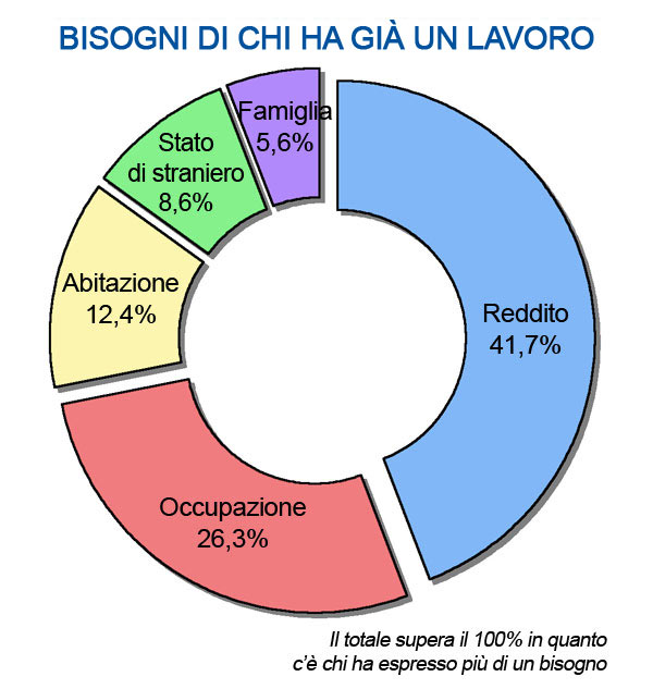 Tra il 2004 e il 2007 sono state distribuite quasi 600 carte, con una media stabile di 160 all’anno e per un importo totale di ben 270,000 euro: una solidarietà di ampie dimensioni. Chi richiede Carta equa spesso è spinto da problemi, spiega la Signorelli, che possono essere raggruppati in 5 ambiti: Economici: diminuzione del reddito oppure insufficienza del reddito in seguito a una nascita, a debiti contratti per mutui, utenze domestiche e credito al consumo. Lavoro: disoccupazione, irregolarità, licenziamento, fallimento o flessibilità, che se non è scelta viene subita da famiglie che al contrario avrebbero bisogno di stabilità. Salute: malattie improvvise, disabilità, depressione, malattia psichica. Famiglia: separazione o divorzio, abbandono, che dimezzano improvvisamente il reddito familiare senza veder calare sensibilmente le spese. Abitazione: affitto, rate di mutui non adeguati, sfratti.