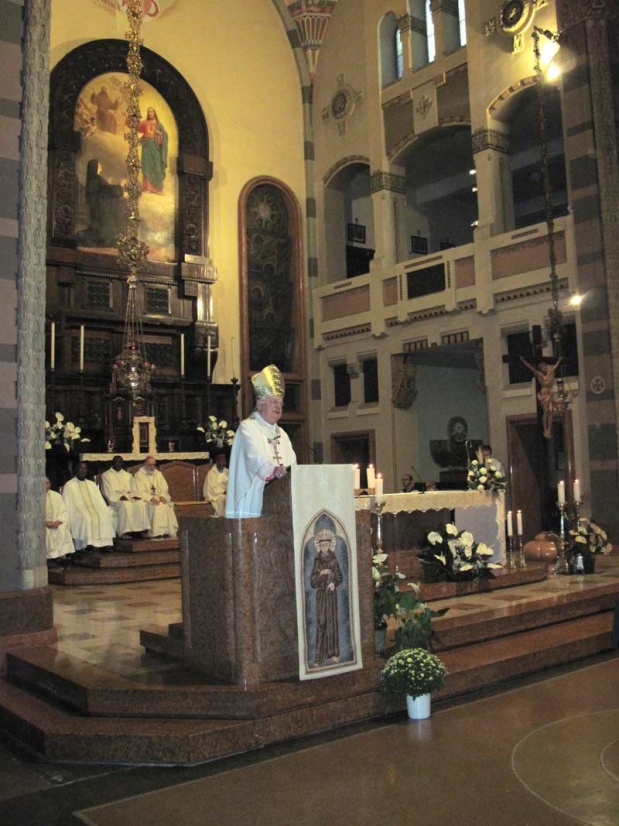 Nella concelebrazione insieme a due vescovi Cappuccini, mons. Franco Cuter di Grajaú (Brasile) e Woldetensaé Ghebreghiorghis di Harar (Etiopia), una quarantina di frati della comunità francescana (compresi alcuni eritrei) si è stretta attorno al Cardinale, offrendo alla presentazione dei doni i segni del tao (simbolo degli oltre 600 volontari), una ciotola di riso (a evocare la fame del mondo, non soltanto materiale) e un sacchetto di noci (richiamo al dare e ricevere nel continuo miracolo dell’Amore).