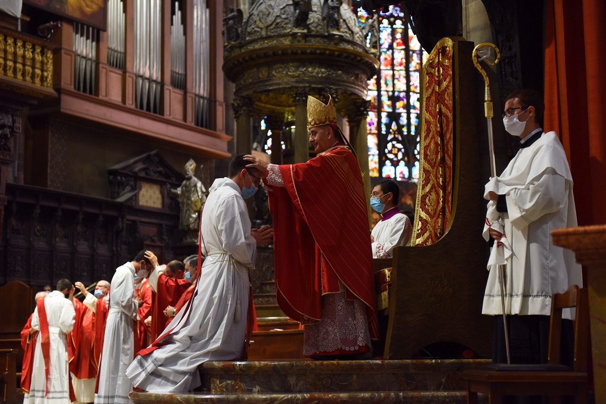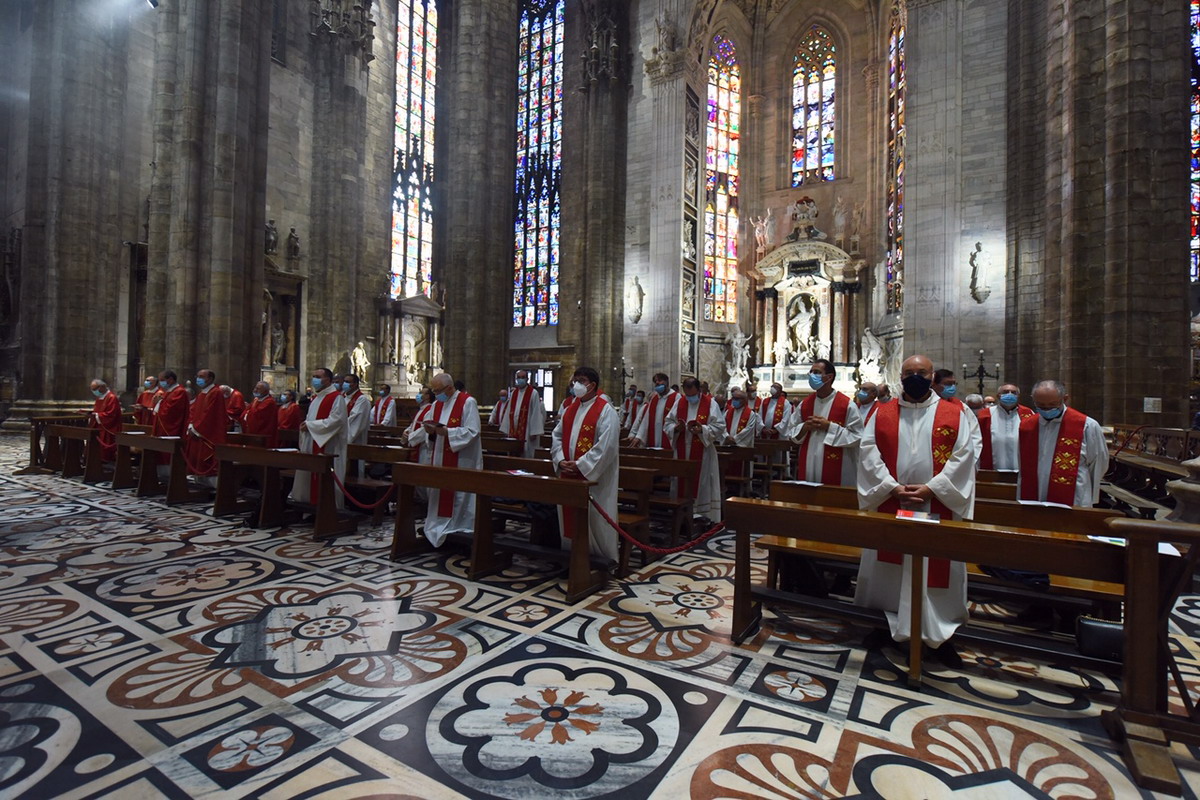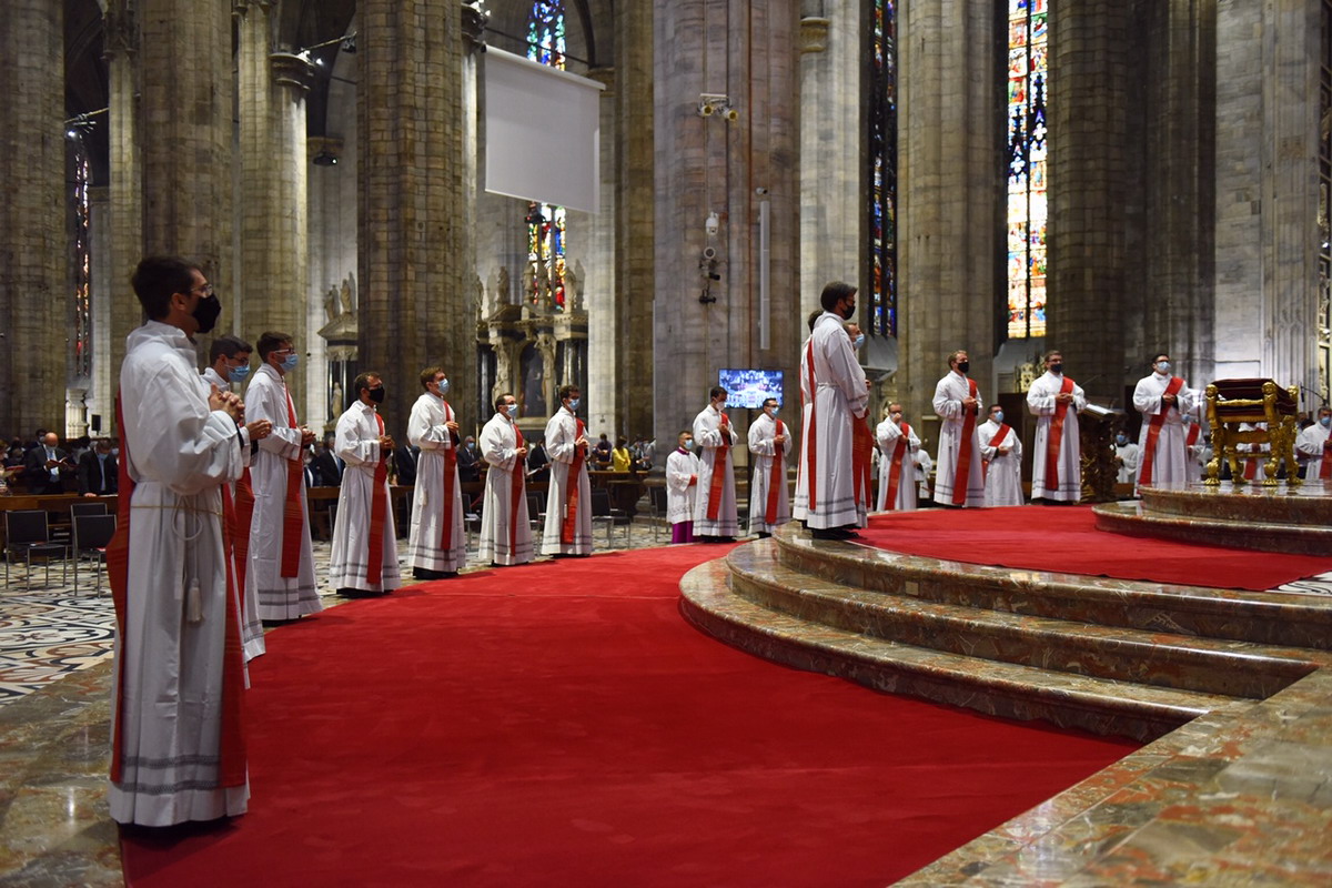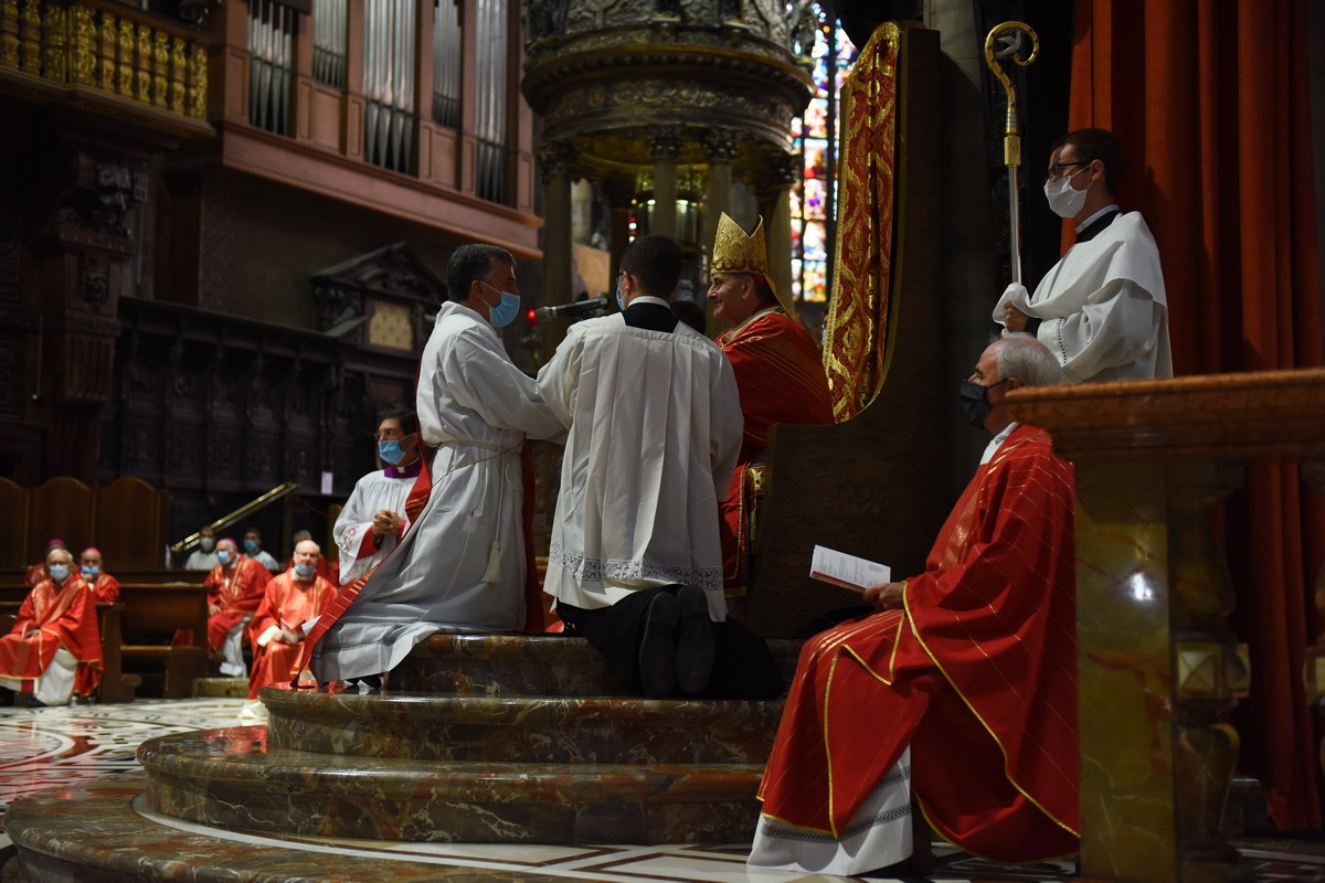 In un Duomo non gremito, come di consueto, dove il distanziamento sociale e tutte le regole antipandemia sono rigidamente rispettate, c’è, comunque, tutta la vivacità e la ricchezza di carismi della nostra Chiesa. Un centinaio di concelebranti, tra loro 8 Vescovi, con il vicario generale, monsignor Franco Agnesi, gli altri membri del CEM, i Canonici del Capitolo metropolitano, i superiori ed educatori del Seminario con il rettore, monsignor Michele Di Tolve, i parroci che hanno accompagnato o accolto i diaconi nelle loro realtà, i diaconi permanenti, i seminaristi, i parenti e i fedeli delle Comunità di provenienza e di destinazione pastorale dei candidati. L’arcivescovo emerito, il cardinale Scola, manda un suo messaggio «di affetto, preghiera e benedizione».