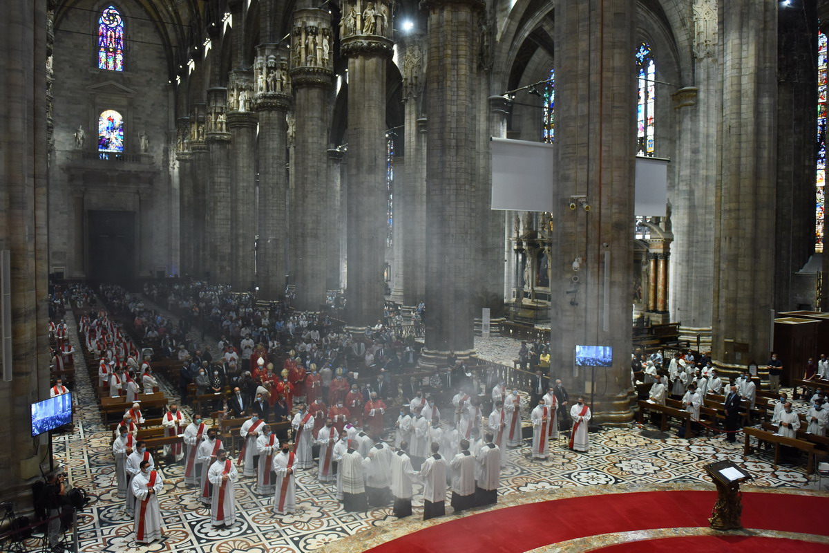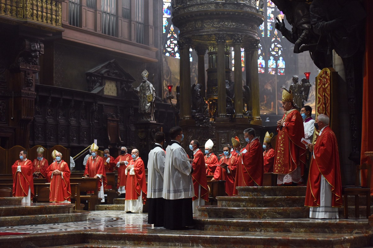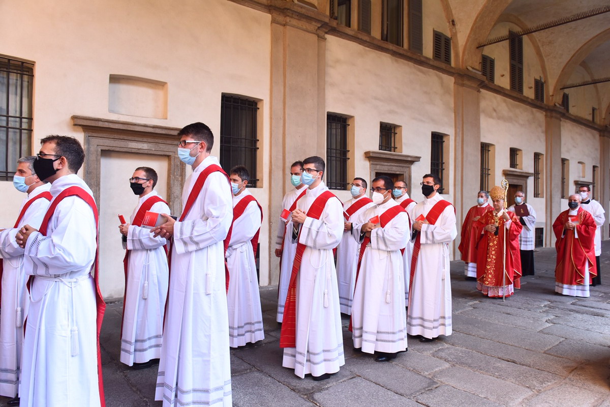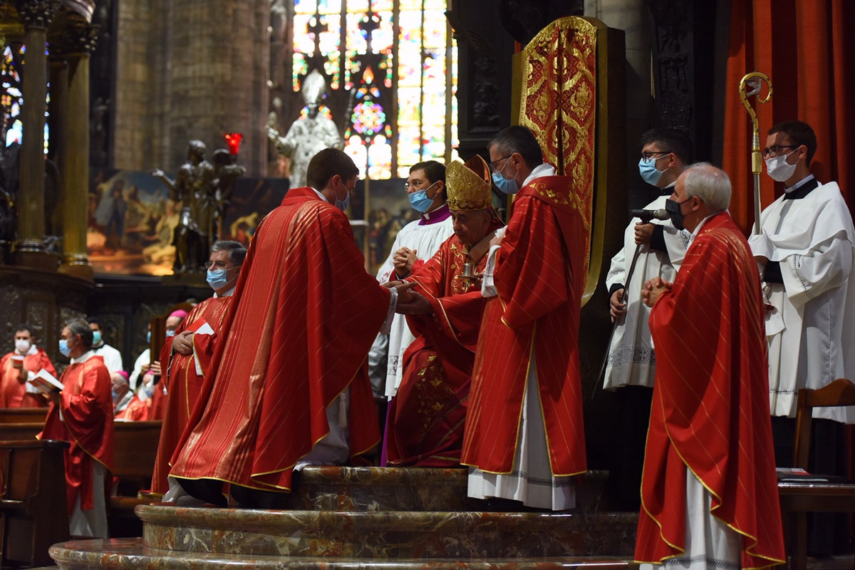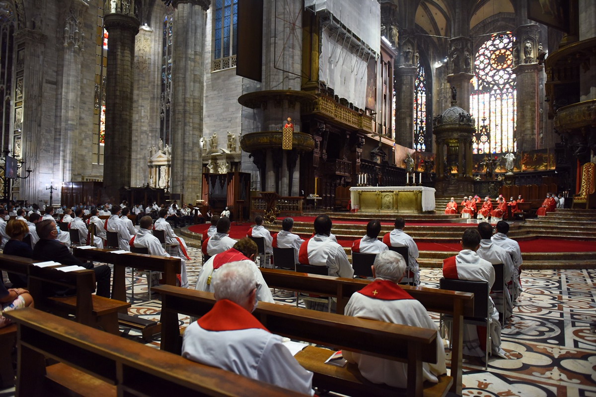 In un Duomo non gremito, come di consueto, dove il distanziamento sociale e tutte le regole antipandemia sono rigidamente rispettate, c’è, comunque, tutta la vivacità e la ricchezza di carismi della nostra Chiesa. Un centinaio di concelebranti, tra loro 8 Vescovi, con il vicario generale, monsignor Franco Agnesi, gli altri membri del CEM, i Canonici del Capitolo metropolitano, i superiori ed educatori del Seminario con il rettore, monsignor Michele Di Tolve, i parroci che hanno accompagnato o accolto i diaconi nelle loro realtà, i diaconi permanenti, i seminaristi, i parenti e i fedeli delle Comunità di provenienza e di destinazione pastorale dei candidati. L’arcivescovo emerito, il cardinale Scola, manda un suo messaggio «di affetto, preghiera e benedizione».