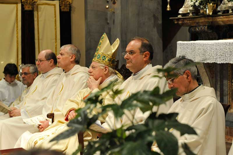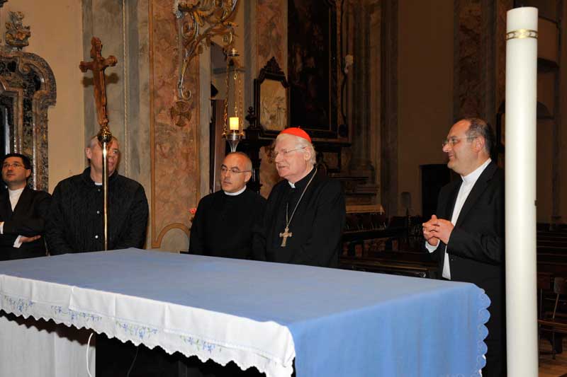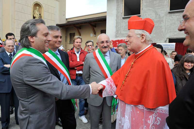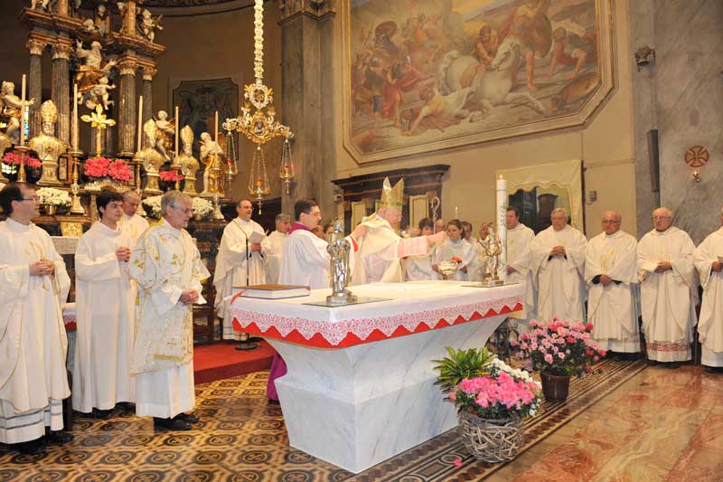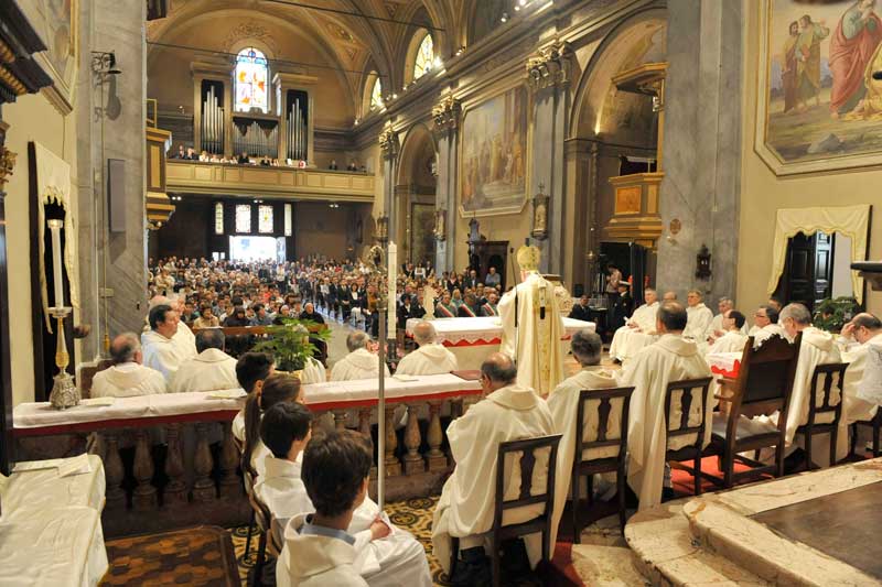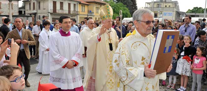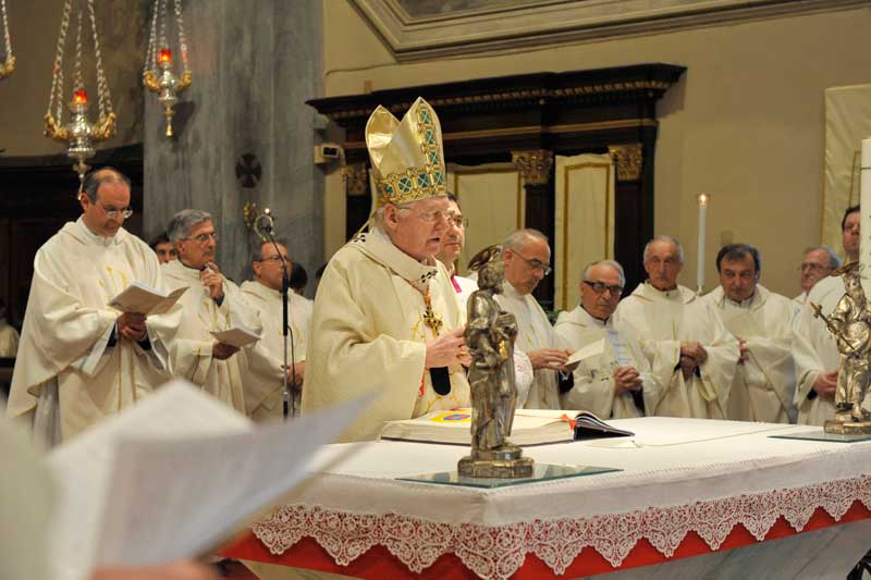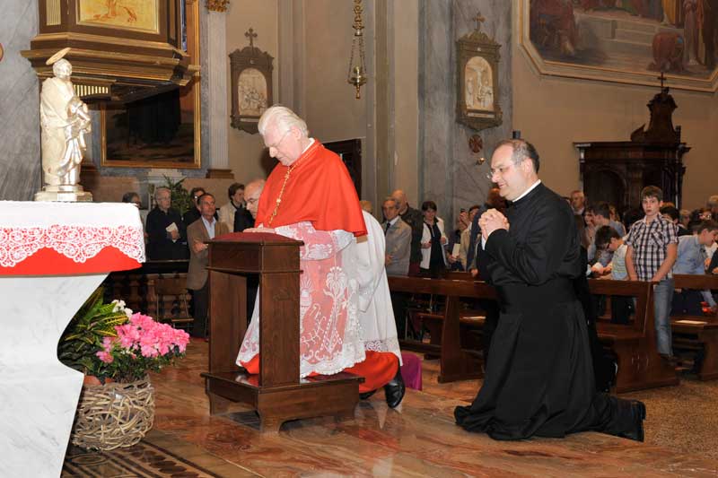 Con il cardinale Scola hanno concelebrato il vicario episcopale di Lecco monsignor Maurizio Rolla, il decano di Erba don Giovanni Afker, il prevosto di Alzate don Lodovico Colombo con il vicario parrocchiale don Marco Tagliabue e numerosi sacerdoti del Decanato erbese. Le Missioni, affidate ai Padri Oblati di Rho, sono state indette – come ha sottolineato il parroco don Lodovico nel saluto al Cardinale – «in ascolto di quanto ci ha suggerito papa Benedetto XVI nella Lettera apostolica Porta Fidei” e di quanto ci ha proposto Lei, Eminenza, nella Lettera pastorale Alla scoperta del Dio vicino, ma non solo. Infatti la nostra Comunità vuole evidenziare due significative ricorrenze: la celebrazione del centenario della Dedicazione di questa chiesa dedicata ai Santi Pietro e Paolo, consacrata il 19 ottobre 1913 dal beato cardinale Andrea Carlo Ferrari, suo predecessore, e i 480 anni dell’immagine miracolosa di Maria presente nel nostro Santuario, luogo di preghiera non solo per la nostra Comunità, ma per tutto il circondario».