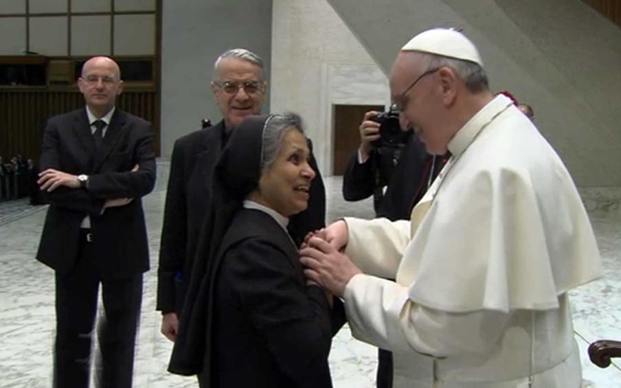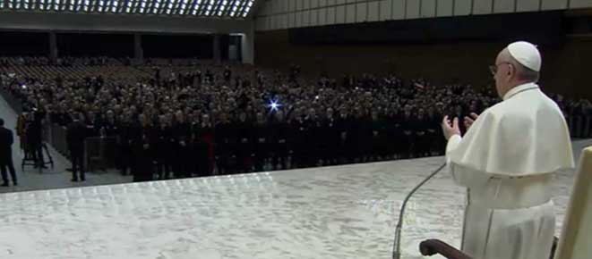 «Grazie per il vostro servizio nei giorni scorsi. Avete lavorato, eh!»: con questa battuta, accolta da un caloroso applauso, Papa Francesco ha salutato i quasi 6 mila giornalisti e operatori della comunicazione arrivati in Aula Paolo VI per partecipare al primo incontro della stampa mondiale con il nuovo Pontefice (all’udienza sono stati ammessi anche moltissimi familiari di giornalisti e operatori).