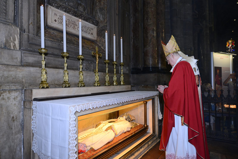 Concelebrano il rito oltre cento sacerdoti, tra cui il cardinale Tettamanzi, sei Vescovi, l’intero Capitolo metropolitano, il vicepresidente della “Fondazione Martini” padre Costa, il Moderator Curiae, mons. Marinoni, i Vicari episcopali di Zona e di Settore, e i segretari succedutisi al fianco di Martini come Pastore di Milano. Nel suo breve indirizzo iniziale l’arciprete del Duomo, monsignor Borgonovo, dice, in riferimento anche al cardinale Schuster: «Quanto è bello e avvincente essere qui, non c’è modo migliore di fare memoria insieme dei due nostri Pastori che furono Ministri e Magistri con un passione che nasce dalla contemplazione di Gesù. Che il Signore ci renda davvero loro e imitatori e discepoli». Con il cardinale Martini si ricorda, infatti, anche Schuster tornato alla casa del Padre il 30 agosto del 1954.