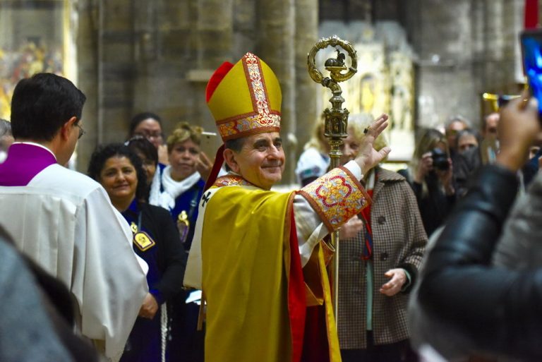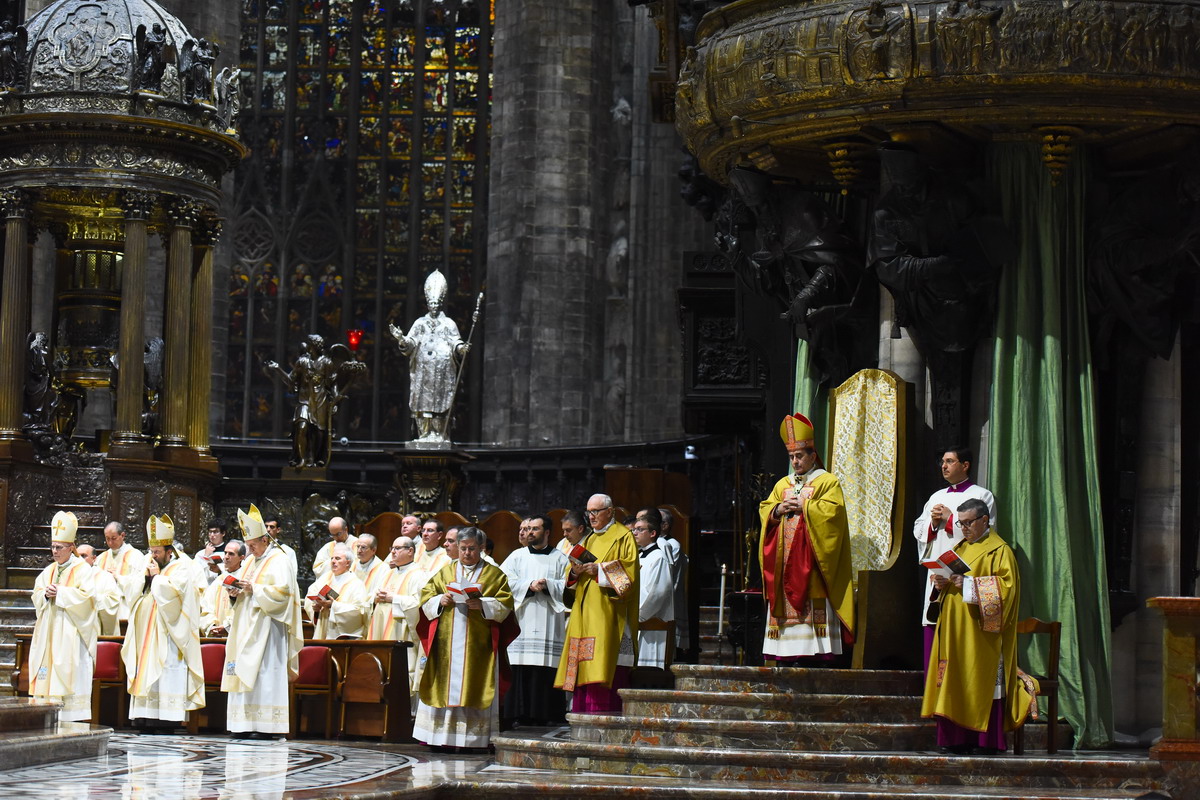 Un inno a essere una cosa sola, alla condivisione della vocazione alla speranza, alla convocazione da cui nasce la vera comunione, quella «al futuro», come la definisce l’Arcivescovo che presiede il Pontificale in onore di san Carlo Borromeo. Celebrazione solenne, vigiliare della domenica, in cui si somma, al ricordo del copatrono della Diocesi, la conclusione dei Lavori del Sinodo minore “Chiesa dalle Genti”. Genti che sono fisicamente presenti in Cattedrale, dove arrivano insieme, in una suggestiva processione formata da oltre 400 persone tra cui i 150 i Delegati del Sinodo che, per tutta la giornata, hanno votato, approvandolo, il Documento finale. Testo consegnato, in conclusione del Pontificale, all’Arcivescovo stesso, il quale, entrando in Cattedrale, porta tra le mani la croce simbolo del Sinodo.