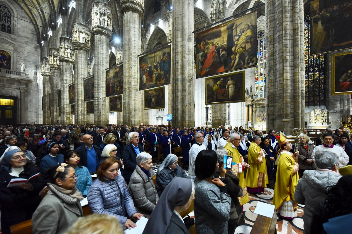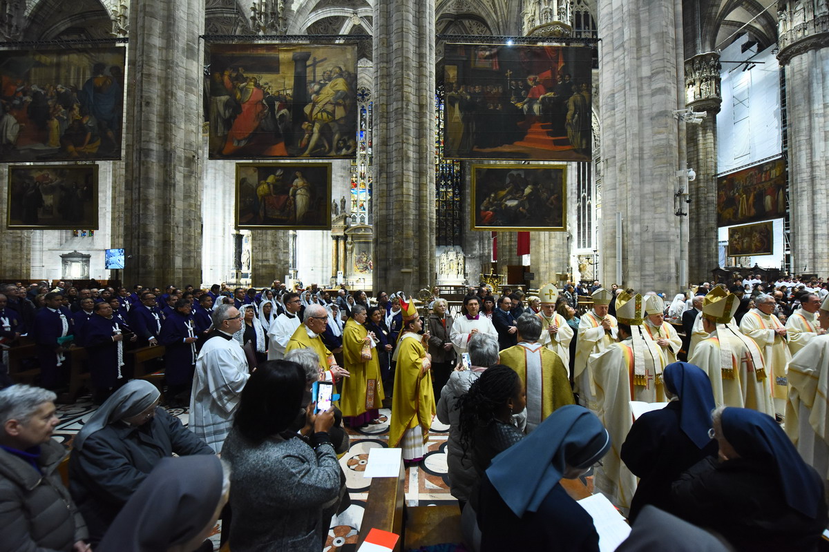 Per prepararsi al meglio alla Celebrazione, alcuni cori etnici eseguono canti nelle varie lingue di origine. Un arcobaleno di suoni, colori, ritmi che in, modo emblematico, si compone idealmente con i Dodici Kyrie peculiari della Liturgia ambrosiana all’’inizio della Messa, concelebrata dai Vescovi ausiliari, dai Vicari episcopali di Zona e di Settore, dai più stretti collaboratori di monsignor Delpini, ma anche da tanti sacerdoti, 150 tra diocesani e ministri delle Cappellanie dei migranti. Tutto parla di armonia: le vesti dei piccoli chierichetti, tipiche delle nazioni di provenienza e quelle delle Confraternite, i canti della liturgia, le intercessioni, la preghiera dei fedeli proposte ancora in tanti diversi idiomi del mondo.