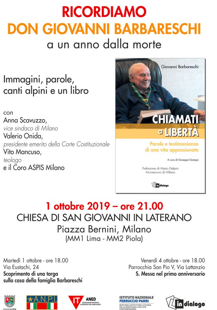 Venerdì 4 ottobre sarà un anno dalla morte di don Giovanni Barbareschi. Così vogliamo ricordarlo. Martedì 1, alle 18 una targa sarà scoperta a Milano al civico 24 di via Eustachi, dove abitava la famiglia Barbareschi. Lo stesso giorno, alle 21, nella chiesa di San Giovanni in Laterano (piazza Bernini), una serata di memoria con cori alpini, un video con parole e immagini di don Giovanni e tre testimonianze affidate ad Anna Scavuzzo (Vicesindaco di Milano), Valerio Onida (già Presidente della Corte costituzionale) e Vito Mancuso (teologo). Tre voci per raccontare l’educatore scout, l’uomo “ribelle” per amore della libertà e infine il prete. Infine la sera del 4 ottobre, alle 18, nella chiesa di San PioV (via Lattanzio), una celebrazione eucaristica di suffragio e di ringraziamento.