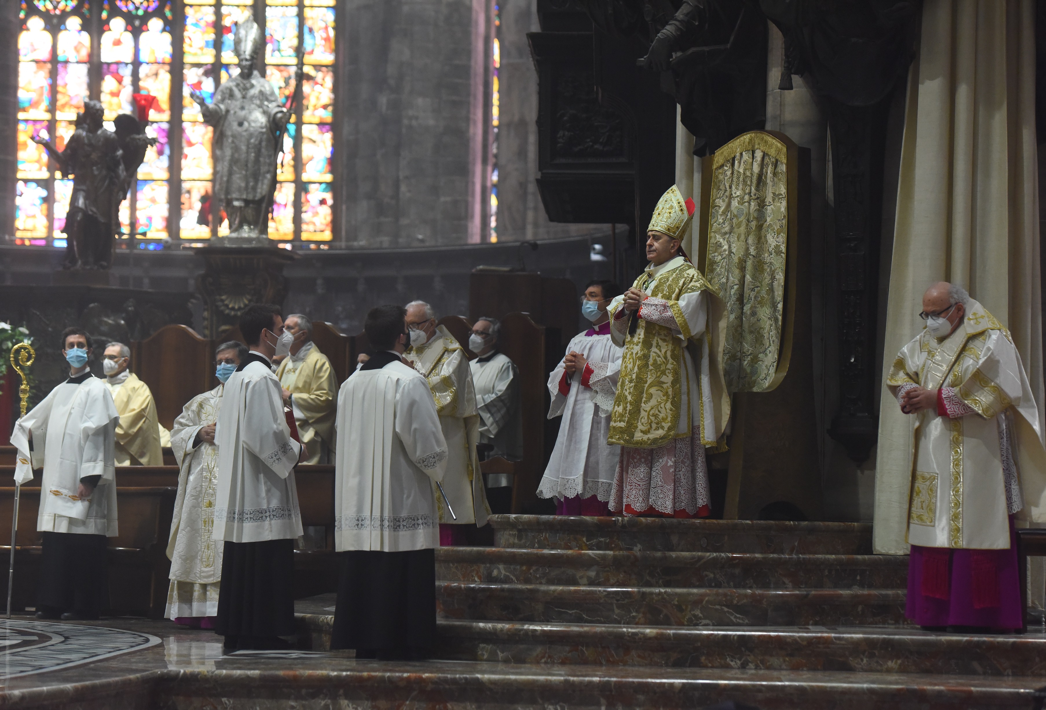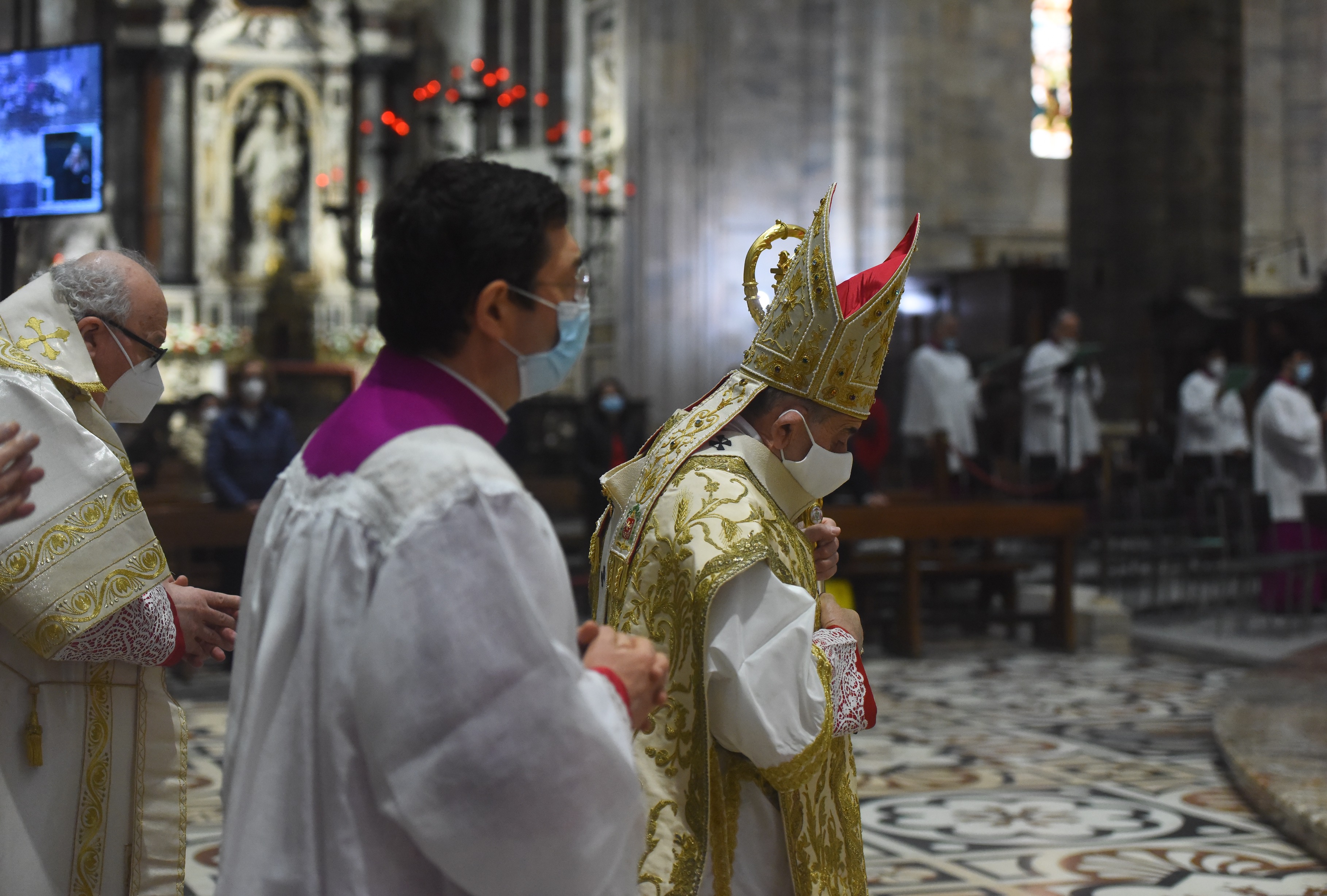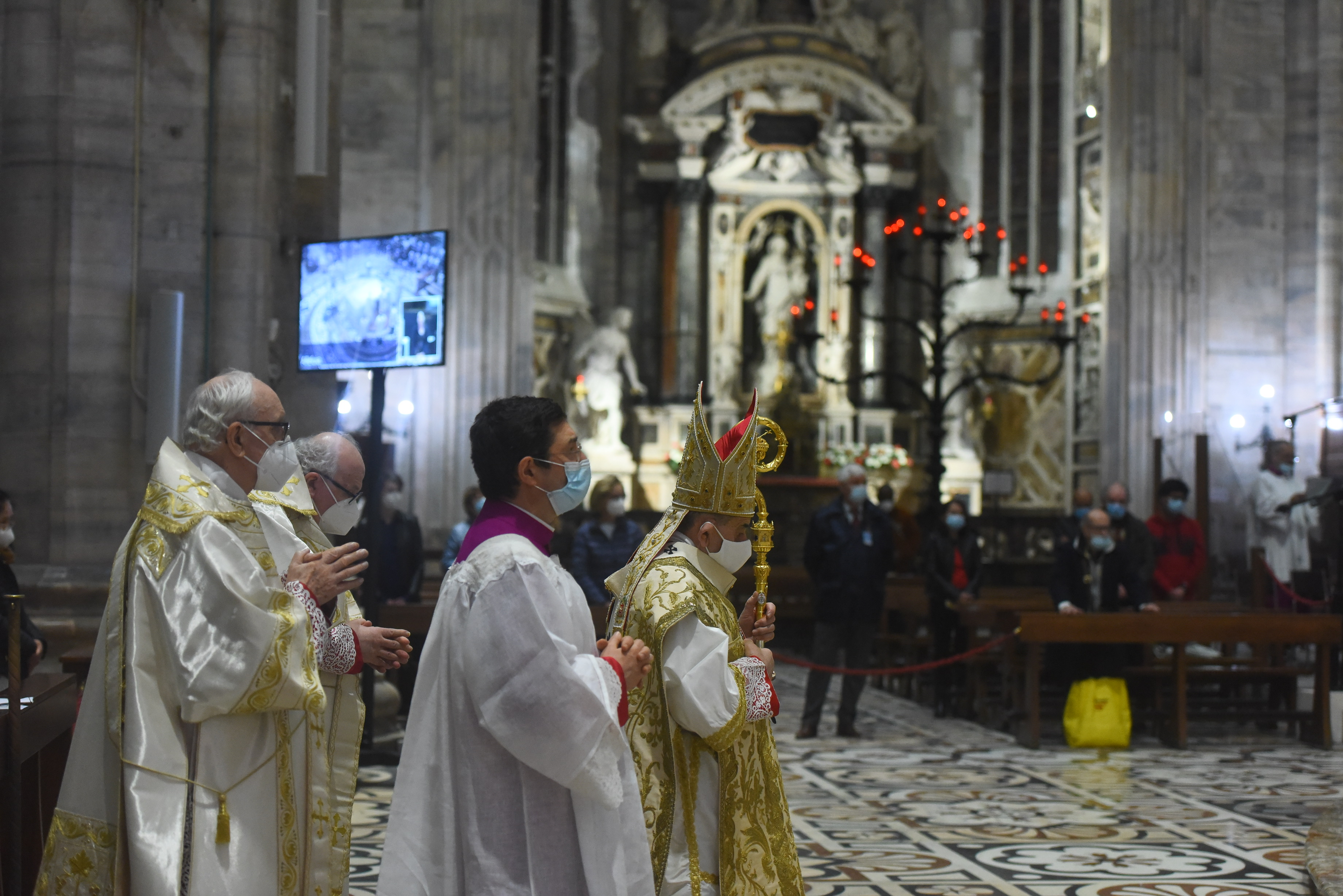 Nella mattina di sole che inonda un Duomo maestoso e magnifico, si celebra “il vero giorno di Dio, radioso di santa luce”, come recita l’Inno del patrono Ambrogio. È la Pasqua di Risurrezione del Signore e, tra le navate della Cattedrale, l’Arcivescovo presiede il Pontificale solenne, concelebrato dai Canonici del Capitolo metropolitano. I Dodici Kyrie della Liturgia ambrosiana, i gesti liturgici, le tre Letture tratte dal Nuovo Testamento – attraverso pagine degli Atti degli Apostoli, della I Epistola ai Corinzi e del Vangelo di Giovanni – definiscono il senso di un partecipare a quel nuovo inizio, più volte sottolineato dall’Arcivescovo in queste ore, del quale mai, forse, come oggi abbiamo bisogno.