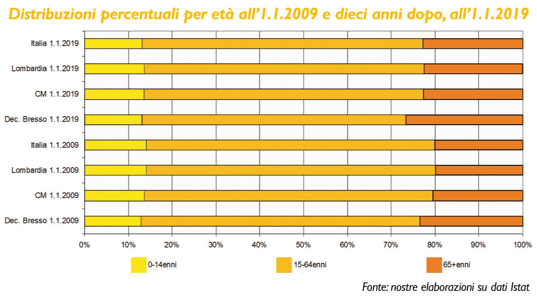Tornando ad analizzare le dinamiche della popolazione nel suo complesso, si rileva che negli ultimi anni è aumentata la femminilizzazione della popolazione residente, con una quota di donne e bambine passata dal 51,7% dello 01/01/2009 al 52,1% dello 01/01/2019), caratterizzandosi rispetto alla media della CM, dove il trend è stato meno accentuato, e soprattutto rispetto alla media lombarda (dove non ci sono state variazioni) e alla media italiana (dove addirittura si è verificato l’opposto, cioè una leggera diminuzione del peso relativo della componente femminile).
