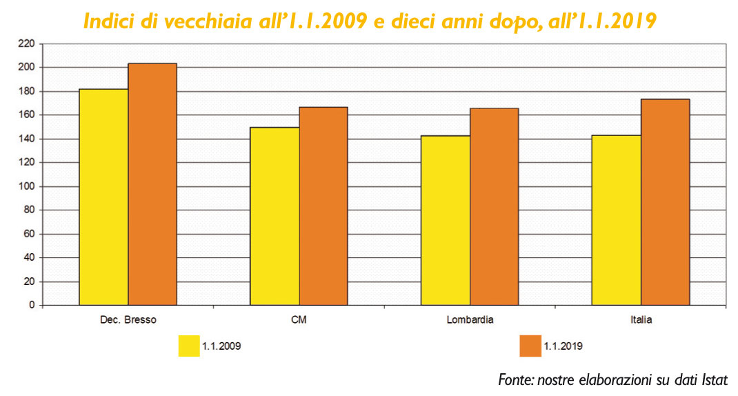 Di conseguenza nel Decanato di Bresso l’indice di vecchiaia supera i duecento punti. Ciò significa che ci sono due anziani per ogni giovane, mentre sia nella CM, sia in Regione, sia in Italia, è il valore parecchio inferiore, tra i 165 e i 173 punti. Allo stesso modo l’indice di dipendenza degli anziani raggiunge i 44,5 punti, cioè a dire quasi un ultra65enne ogni due persone in età attiva, mentre altrove (nella CM, in Regione e in Italia) oscilla quasi una decina di punti più in basso.