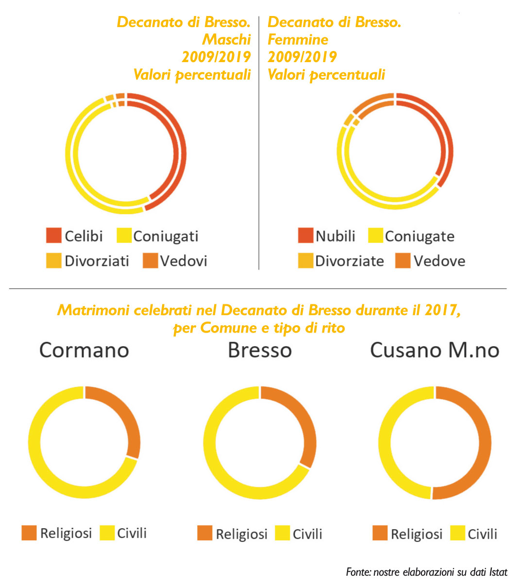 Secondo gli ultimi dati disponibili, durante il 2017 nel Decanato sono stati celebrati 143 matrimoni: 49 a Bresso e 47 sia a Cormano, sia a Cusano. A Bresso e a Cormano c’è stata una maggiore incidenza di matrimoni civili, i quali in entrambi i Comuni sono stati 33 contro meno della metà, e per la precisione rispettivamente 16 e 14, di quelli religiosi. Il rapporto in questi due Comuni è stato dunque di più di due matrimoni civili per ogni matrimonio religioso, mentre a Cusano Milanino i due riti di matrimonio si sono equivalsi numericamente, anzi con una leggera prevalenza di quelli religiosi: 24 contro 23 civili. Secondo i dati più recenti disponibili, sempre riferiti al 2017, i matrimoni civili rappresentano nel Decanato il 62,9% del totale, valore di 7 punti inferiore a quello della CM (69,4%), di poco superiore a quello lombardo (62,1%), e ben oltre 13 punti al di sopra di quello nazionale (49,5%).