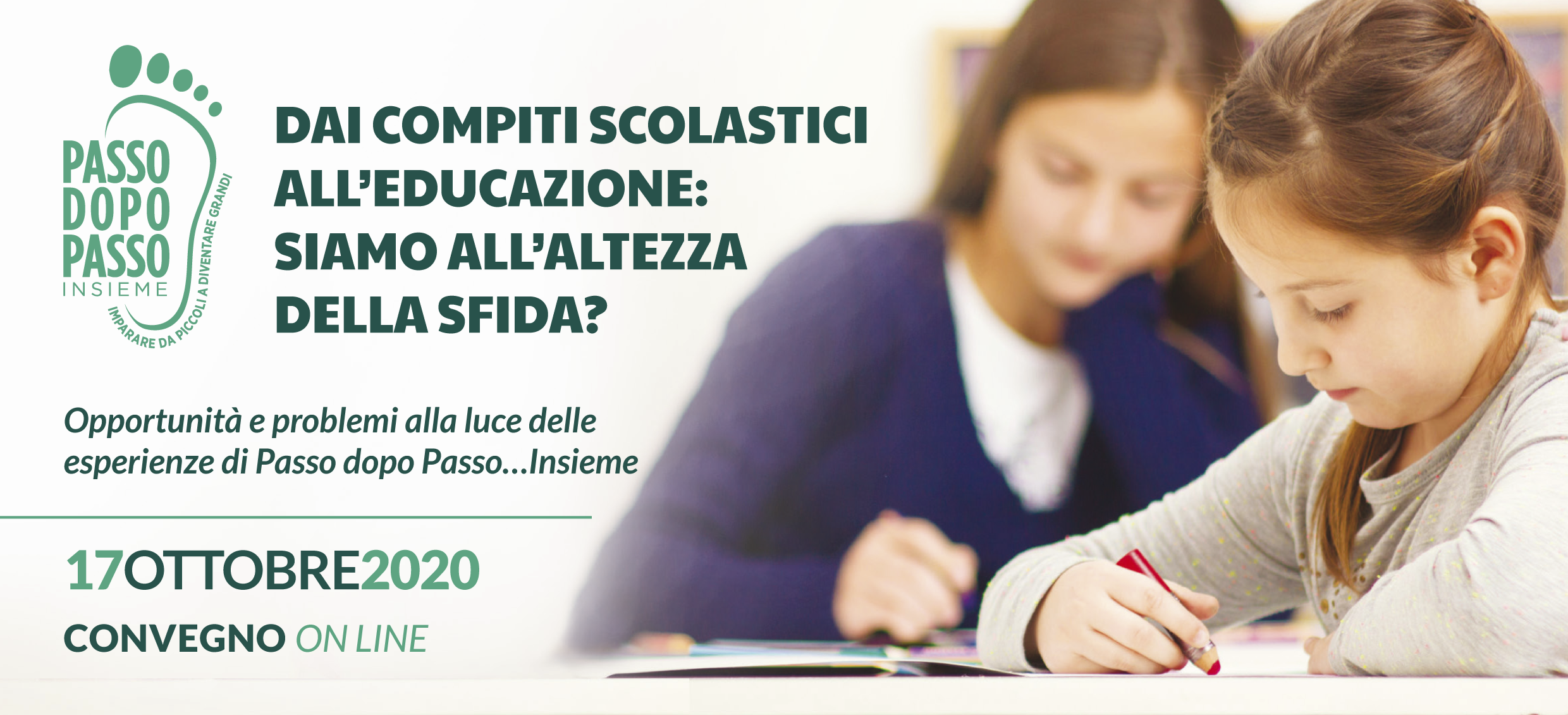 Sabato 17 ottobre si svolgerà online il convegno «Dai compiti scolastici all’educazione: siamo all’altezza della sfida?», organizzato dall’Associazione Passo dopo Passo…Insieme. Scopo del convegno è condividere le competenze maturate in seno all’associazione in quasi vent’anni di lavoro innovativo con i preadolescenti delle scuole medie. Fin dall’inizio, nel 2003, l’obiettivo è stato quello di non limitarsi ad assistere i ragazzi nello svolgimento delle attività pomeridiane, ma di integrarsi con il lavoro fatto a scuola e dar loro le competenze “umane” e le motivazioni per studiare autonomamente, costruendo per loro la possibilità di vivere serenamente il momento dei compiti a casa.