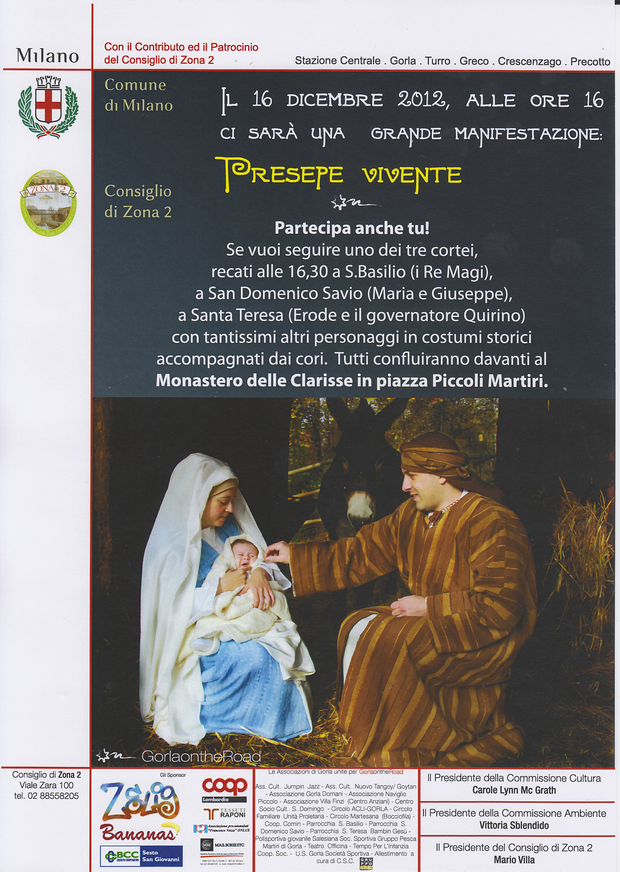 Questa l’intuizione vincente di Giuseppe Carfagna, regista per caso ed ex professore di lettere, che ha trovato larghissimo consensoe spazio nel programma delle iniziative natalizie varate dal Consiglio di Zona 2. L’idea ha suscitato entusiasmo passione organizzativa nella nutrita rete di associazioni di volontariato che operano da anni nei quartieri della zona: Associazione Villa Finzi per gli anziani, Circolo Martesana, Associazione Gorla Domani, Acli di Gorla, varie associazioni sportive e ricreative, le parrocchie di San Basilio, San Domenico Savio e Santa Teresa del Bambin Gesù.