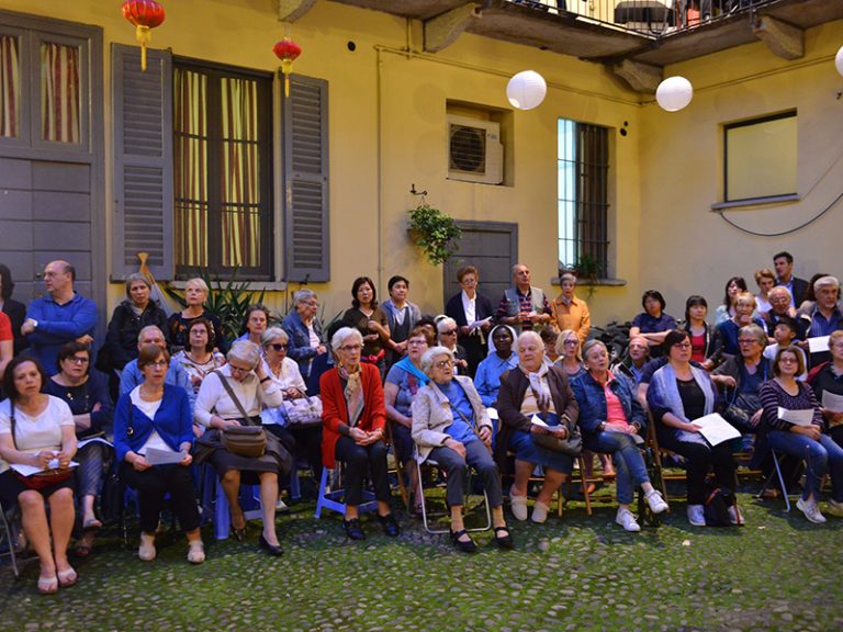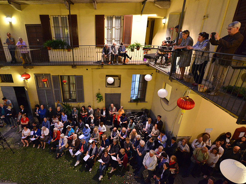 Infine nel cortile risuonano antiche melodie cinesi ed europee, queste ultime eseguite con uno strumento nato per accompagnare il Canto gregoriano e poi le Chansons medioevali. La conclusione, prima della festa conviviale? Inevitabilmente Oh mia bela Madunina, cantata da tutti, milanesi vecchi e nuovi.