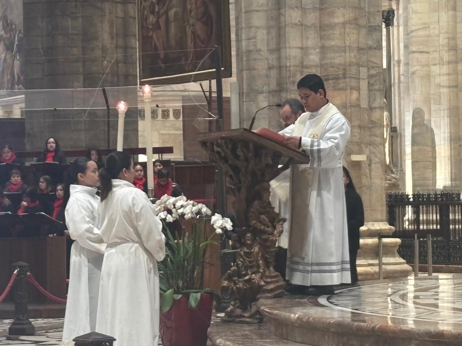 «È un momento di fede, di festa, di gioia grande. La nostra gente, che si ritrova qui stasera, dice tutto questo con la fedeltà alla tradizione e con la vita vissuta tutti i giorni a Milano». La voce del vicario della Comunità filippina della Basilica di Santo Stefano Maggiore, parrocchia personale dei Migranti, don Sonny De Armas Umali, è chiara e distesa mentre attende di fare il suo ingresso sull’altare maggiore della Cattedrale per la celebrazione del Simbang Gabi – Ikalawang Araw, che, con grande solennità nella prima Messa detta “del Gallo”, avvia la novena che prepara questa numerosa comunità al Natale. Festa liturgica che ebbe inizio nel 1669, durante la colonizzazione spagnola delle Filippine, e che rimane uno dei momenti-cardine della vita dei fedeli di origine filippina sparsi in ogni parte del mondo.