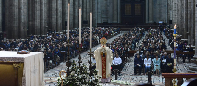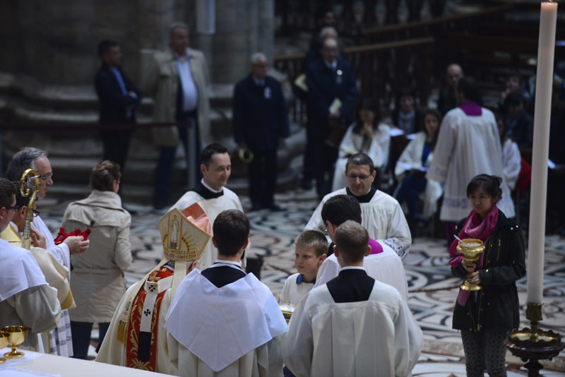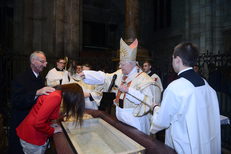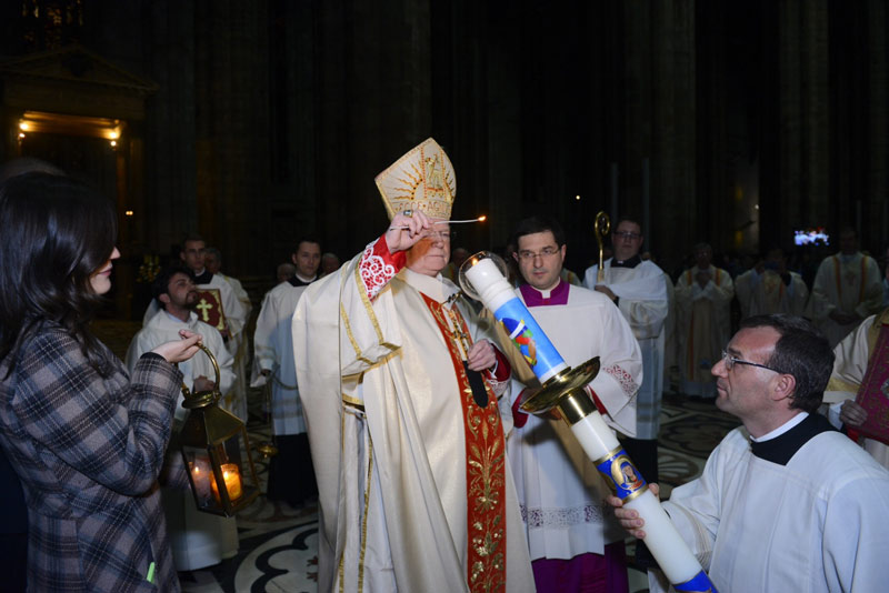 È la Veglia nella Pasqua di Risurrezione del Signore, madre di tutte le Sante veglie, come la definì sant’Agostino, che si apre, presieduta dal cardinale Scola, in Duomo con l’accensione del cero pasquale al lume portato, all’Arcivescovo, dai tredici Catecumeni che hanno mosso in breve processione dalla chiesa di Santa Maria Annunciata in Camposanto fino all’ingresso della Cattedrale. Concelebrano i Canonici del Duomo e sono presenti, inviati specificamente per l’occasione, la parrocchia milanese di Santa Maria della Scala in San Fedele, la Rettoria San Raffaele e cinquanta membri del Cammino Neocatecumenale.